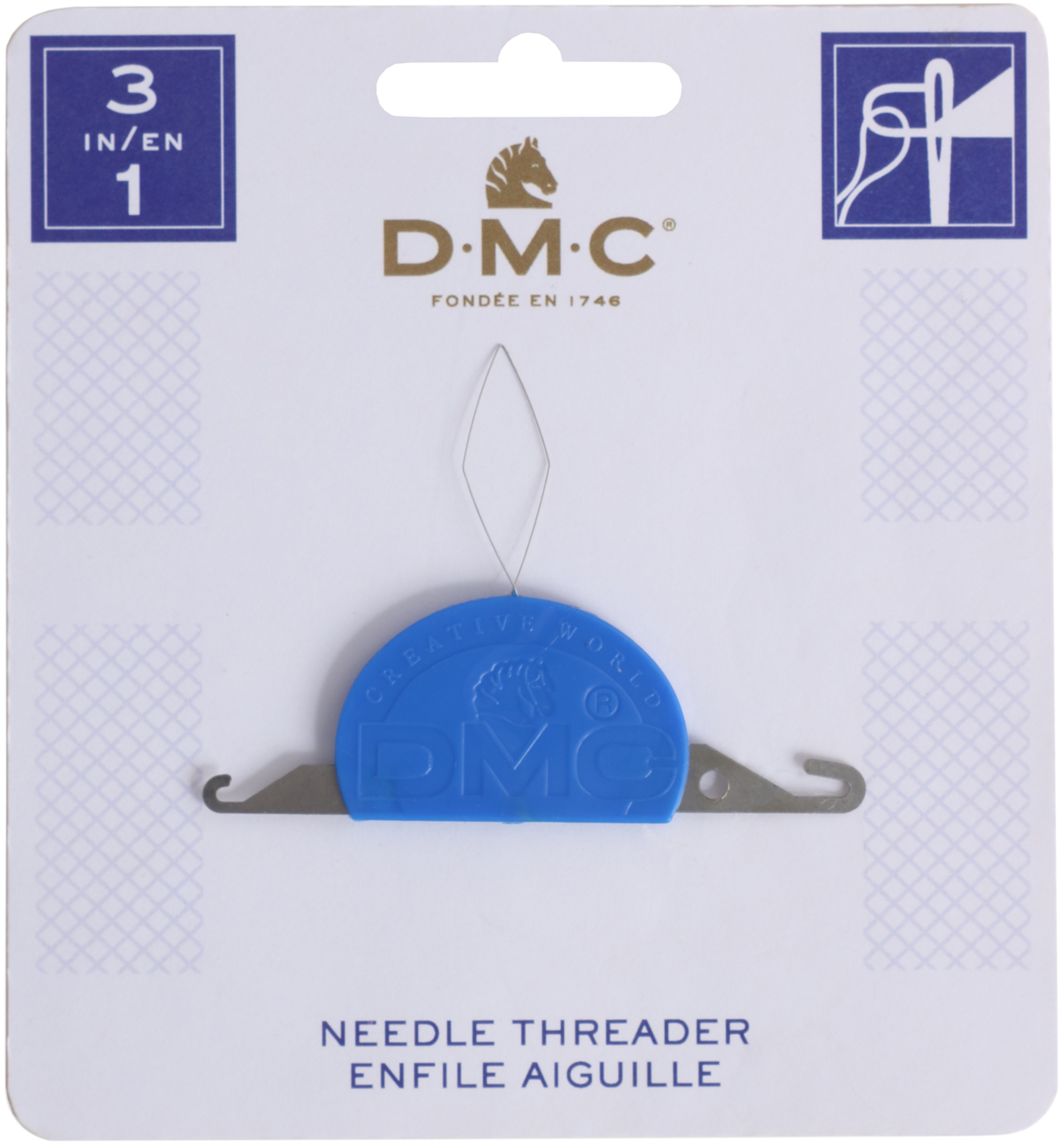DMC-Needle Threader. This 3-in-1 tool is handy and can help thread yarns and threads in a variety of weights! It can thread fine thread, medium weight yarns and threads and heavy weight yarns. It acc ommodates short and long needle eyes. This 4x4-1/2 inch package contains one aluminum needle threader. Imported.