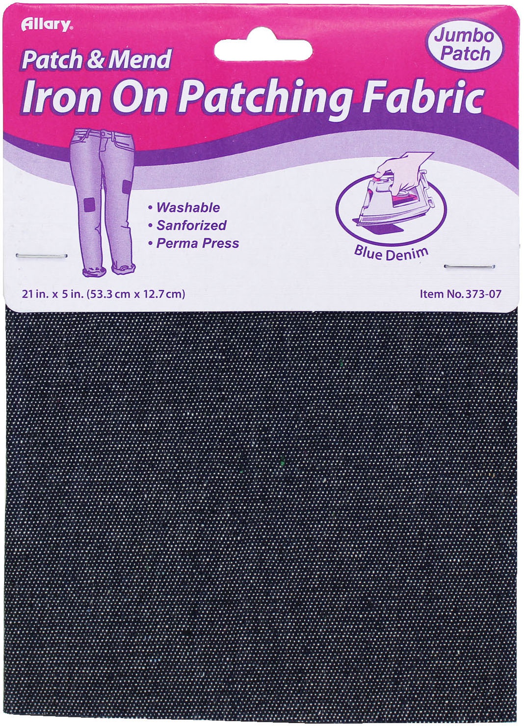 Contains one jumbo sheet of blue denim patching fabric. Machine washable.