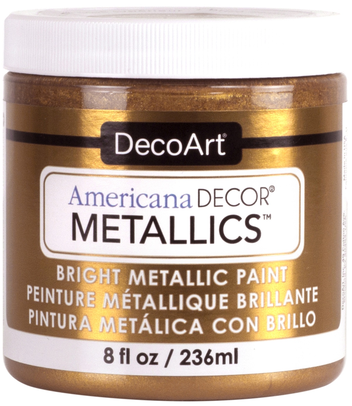 Deco Art-Americana Decor Metallics. Add the highest metallic finish to home decor projects with this advanced, highly-pigmented formula. Perfect for subtle accenting or full coverage application. This package contains 8oz of metallic finish. Conforms to ASTM D 4236. Comes in a variety of colors. Each sold separately. Made in USA.
