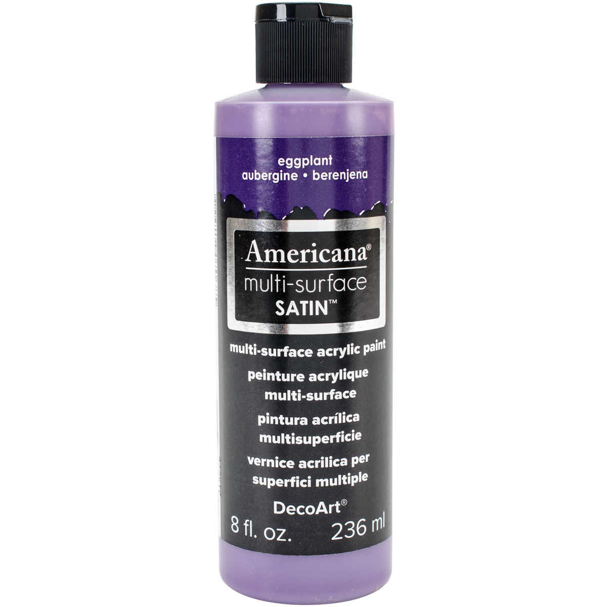 DECO ART-Americana Multi Surface Satin Acrylic. This multi-surface paint will give a durable, opaque satin finish! It works great with wood, metal, glass, terra cotta, ceramics, paper mache, most plastics, fabric and canvas. For indoor and outdoor use. This package contains an 8 oz bottle of satin acrylic. Available in a variety of colors, each sold separately. Conforms to ASTM D 4236. Made in USA.