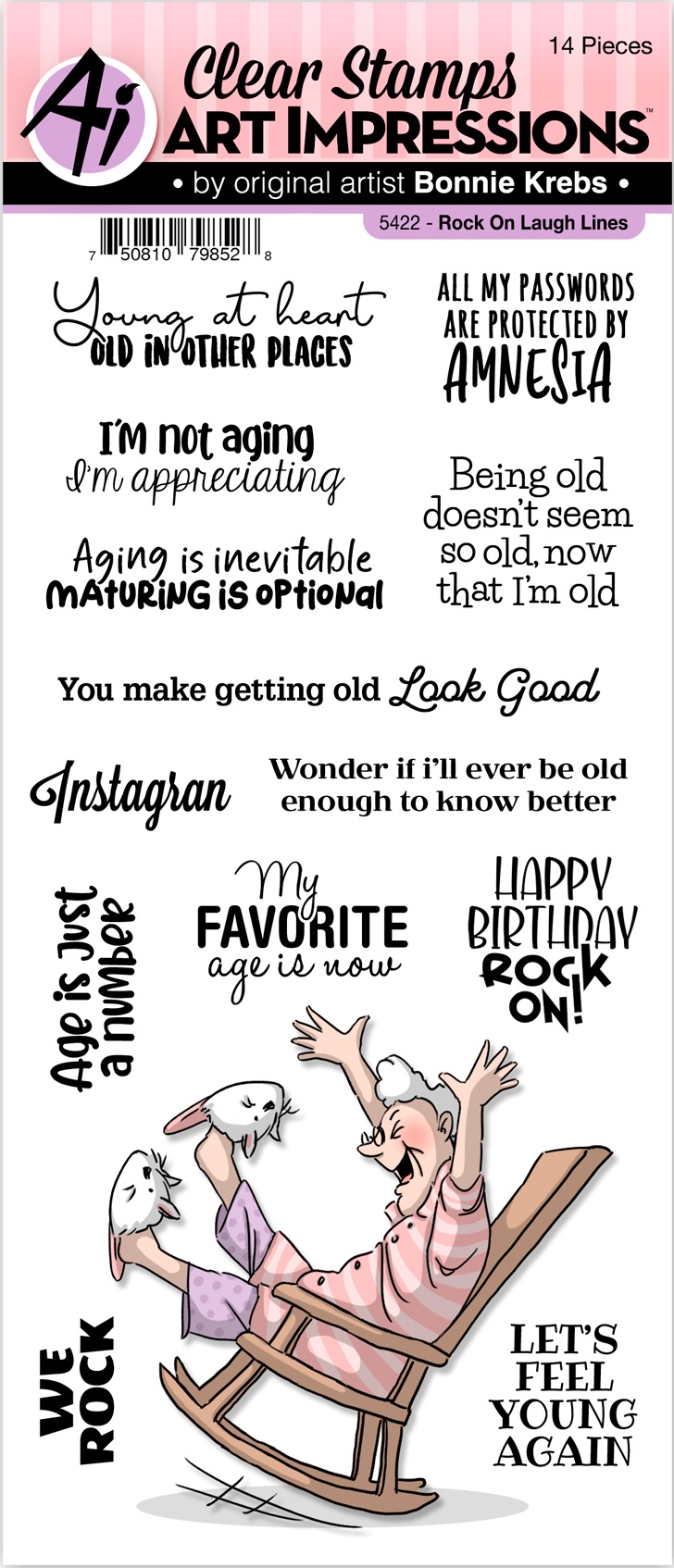 This clear stamp set features a blue-haired party animal in her rocking chair, having a blast! Sentiments include : Young at heart Old in other Places, All my passwords are protected by amnesia, I'm not aging, I'm appreciating, Being old doesn't seem so old, now that I'm old, You make getting old Look Good, Instagran, Wonder if I'll ever be old enough to know better, Age is just a number, My favorite age is now, Happy birthday rock on!, We rock, Let's feel young again.