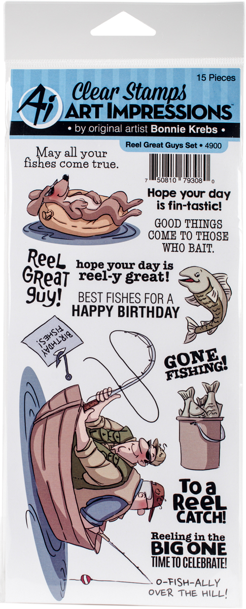 Art Impressions-Work And Play Clear Stamp Set. Add wonderful images and phrases to cards and more with these repositionable cushioned stamps! With such a large variety of animated stamps, you are sure to find the perfect match for every project! This package contains Reel Great Guys: a set of fifteen clear stamps on one 7-3/4x3-3/4 inch backing sheet. Made in USA.