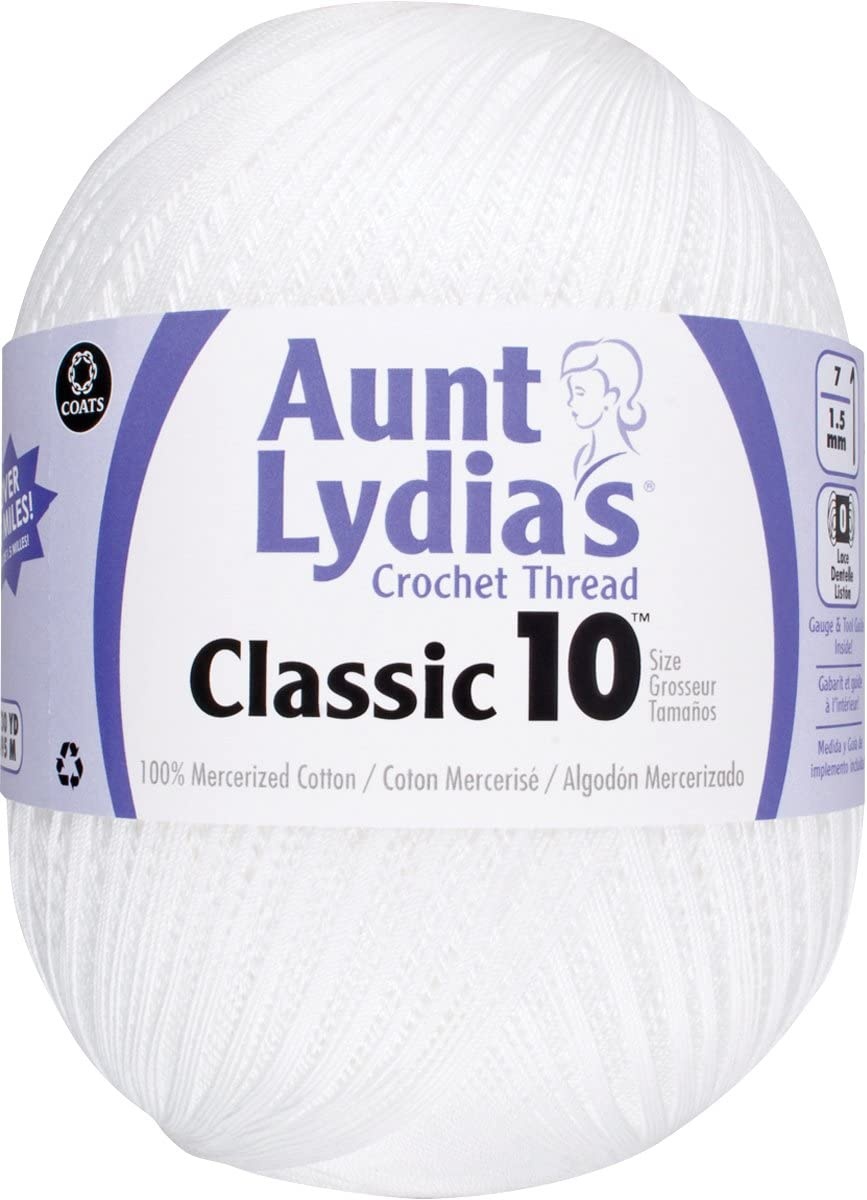 AUNT LYDIA-Jumbo Crochet Cotton. Truly an economy put-up, over 1.5 miles of crochet cotton! Use on bedspreads, table cloths, doilies, apparel, accessories and more. Content: 100% mercerized cotton. 2730yd/2495m on 7/1.5mm crochet hook. Care: machine wash gentle cycle, warm water, no bleach, rinse well and promptly remove, roll in towel and block. Imported.