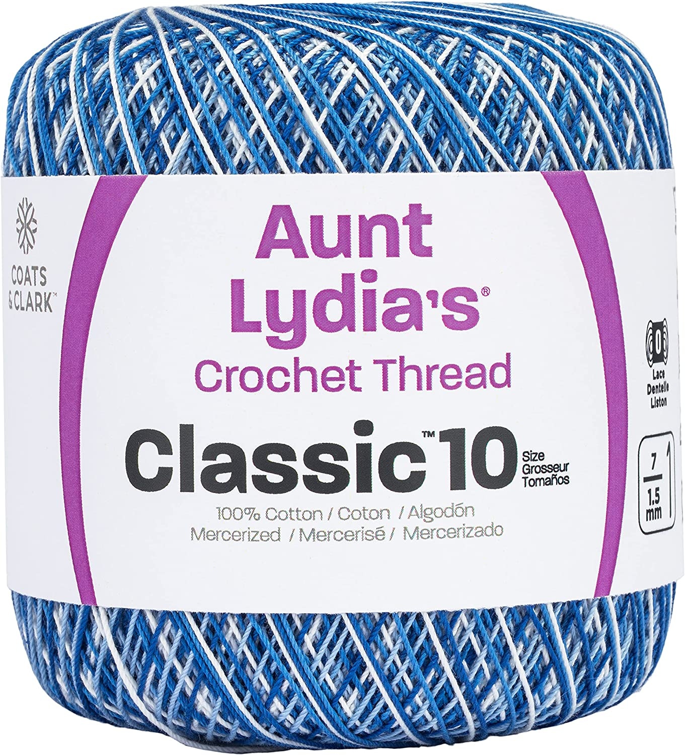 Aunt Lydia's-Crochet Cotton. This high luster mercerized cotton crochet thread is perfect for crochet projects both large and small. This thread is available in a wide range of fashion solids, neutral basics and alluring multi-colors that are ideal for home decorating and fashion projects. Article 154 is a size 10, bedspread weight, 3ply 100% mercerized cotton thread. White and Ecru: 400yd/365.75m, Solids: 350yd/320m and Shaded Colors: 300yd/274.3. Size 7/1.5mm crochet hook is recommended. Care: machine wash (max.temp. 104F/40C), dry flat, do not bleach, do not dry clean, OK to iron. Dyelotted: we try but are not always able to match dyelots. Available in a variety of colors. Each sold separately. Imported.