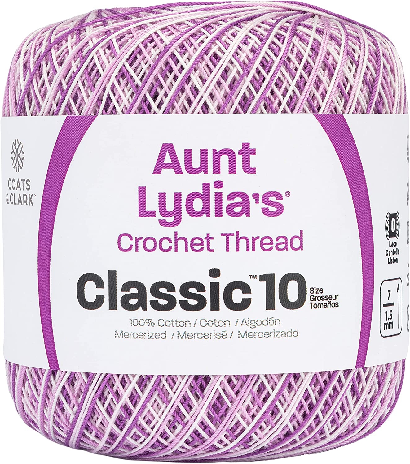 Aunt Lydia's-Crochet Cotton. This high luster mercerized cotton crochet thread is perfect for crochet projects both large and small. This thread is available in a wide range of fashion solids, neutral basics and alluring multi-colors that are ideal for home decorating and fashion projects. Article 154 is a size 10, bedspread weight, 3ply 100% mercerized cotton thread. White and Ecru: 400yd/365.75m, Solids: 350yd/320m and Shaded Colors: 300yd/274.3. Size 7/1.5mm crochet hook is recommended. Care: machine wash (max.temp. 104F/40C), dry flat, do not bleach, do not dry clean, OK to iron. Dyelotted: we try but are not always able to match dyelots. Available in a variety of colors. Each sold separately. Imported.