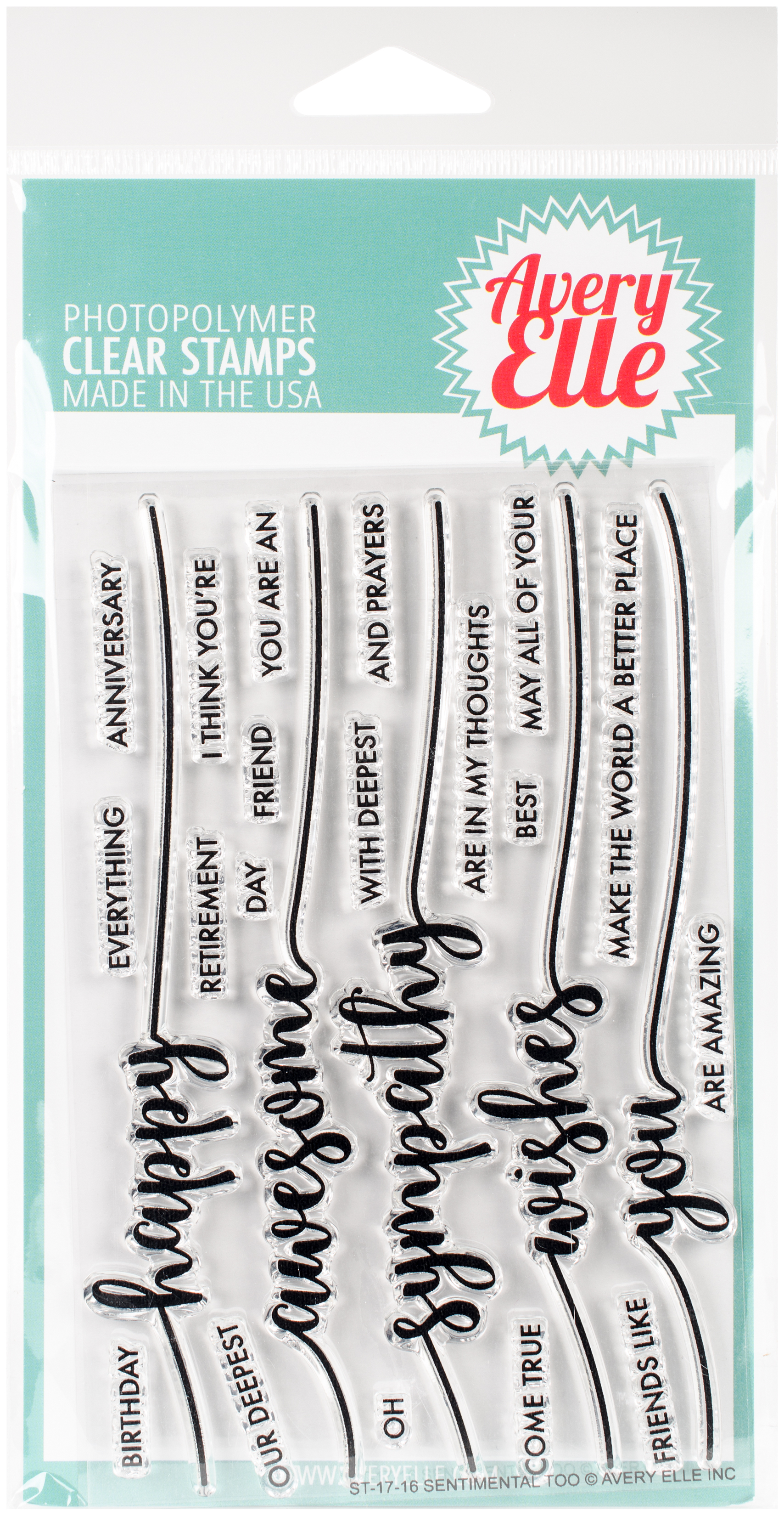 Avery Elle-Clear Stamps. These clear stamps peel off their backing and stick to any acrylic block making for easy stamping. Simply apply your favorite ink and stamp crisp clear images! They are made from 100% photo-polymer which is latex free, phthalate free, non-toxic and biodegradable. This package contains Sentimental Too: a set of twenty-four clear stamps on a 4x6 inch backing sheet. Coordinates with die set Sentimental Too (D-17-16.) WARNING: Choking Hazard, keep out of reach of children. Made in USA.