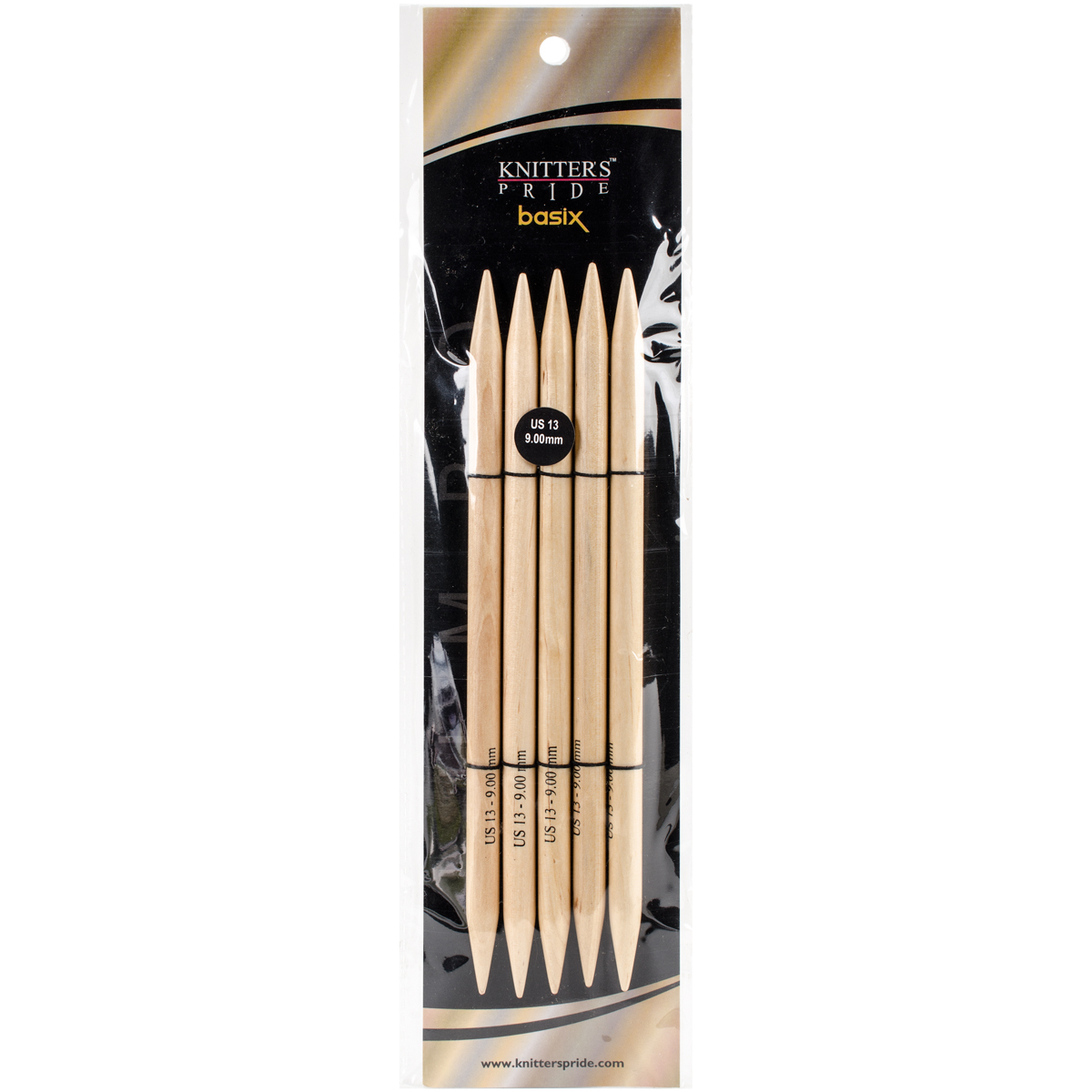 Knitter's Pride-Basix Double Pointed Needles. Basix birch needles have the lightness of birch and the strength of natural wood. They are ideal for today's chunky yarns- easy stitch glide and no snagging. They are gentle in the hand and provide hours of comfortable knitting with no hand fatigue. This package contains five 8 inch long double pointed needles in one size. Comes in a variety of sizes. Each sold separately. Imported.