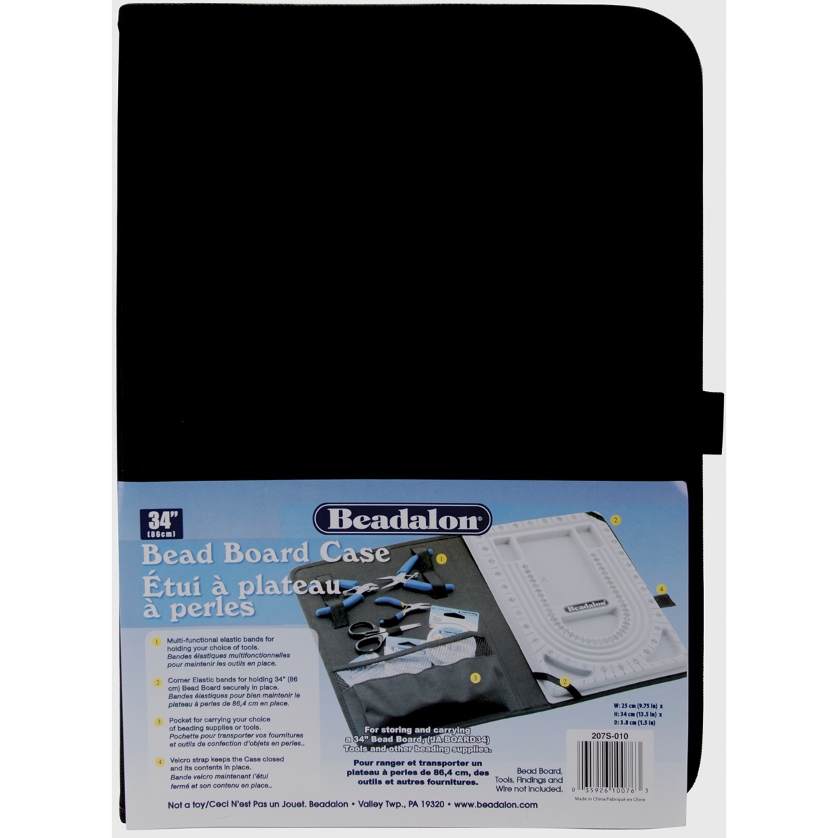 BEADALON-Bead Board Case. Keep your key beading supplies organized and handy! This case features multi-functional elastic bands for holding your choice of jewelry-making tools, corner elastic bands for holding a 12-1/4x8-3/4in bead board (34in design length), plus a handy pocket for carrying your choice of beading supplies or tools. Velcro straps on the outside keep the case closed and your contents secure. Case is made of black canvas and measures 13-1/2x9-3/4x1- 1/2in). Tools and bead board not included. Imported.