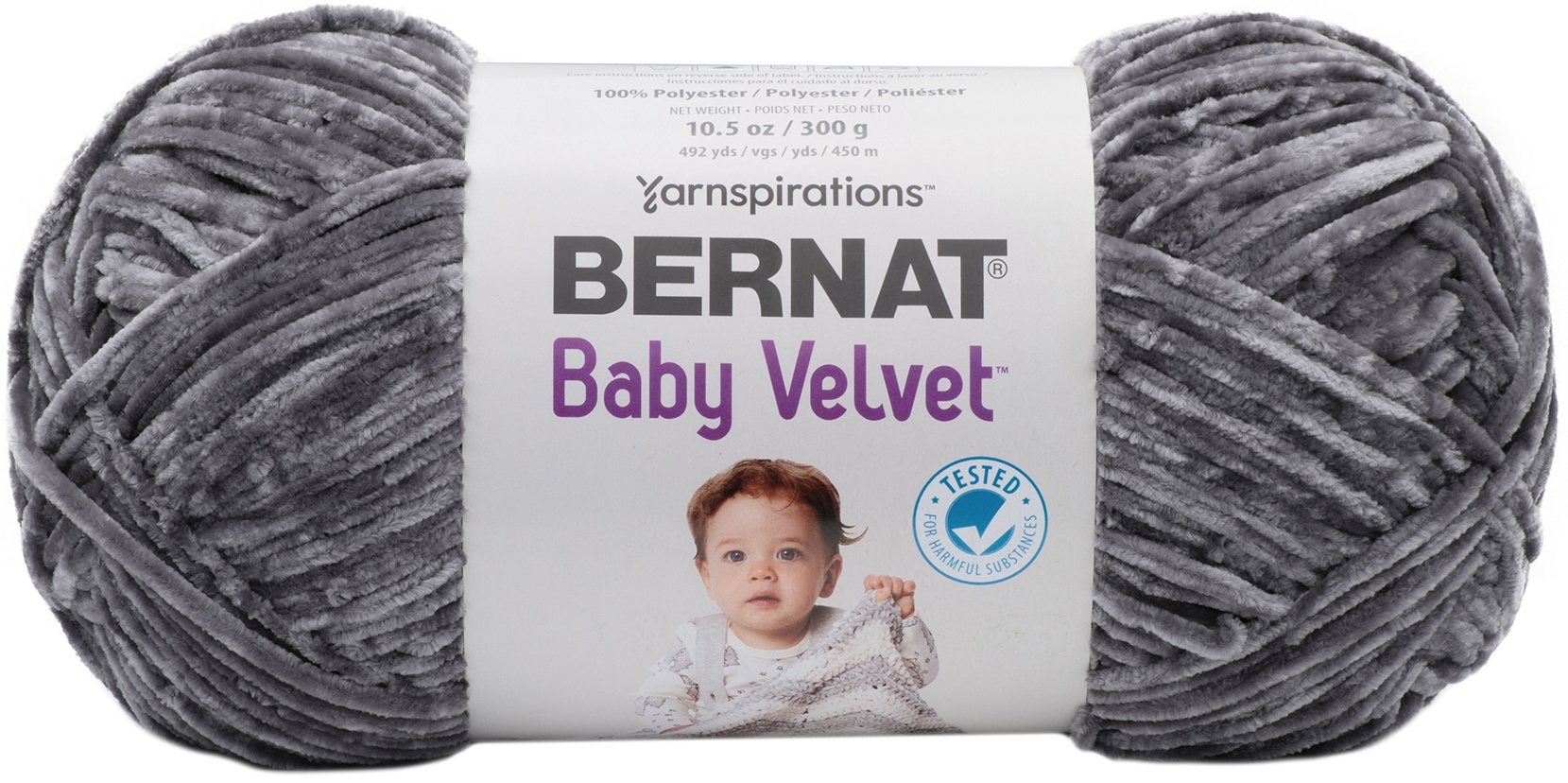 BERNAT-Baby Velvet. The Bernat Baby Velvet yarn is a luxuriously soft worsted weight yarn that is perfect for nursery projects. Its velvet texture doesn't pill or shed, creating machine washable projects that are a joy to stitch. From blankets to booties, you can get creative with knit and crochet patterns using this yarn. Weight category: 4. Content: 100% polyester. Putup: 10.5oz/300g, 492yd/450m. Gauge: 16sx14r = 4in/10cm on size US7/4.5mm knitting needles. Suggested crochet hook: USH8/5mm. Dyelotted: we try but are not always able to match dyelots. Machine wash and dry. Comes in a variety of colors. Each sold separately. Imported.