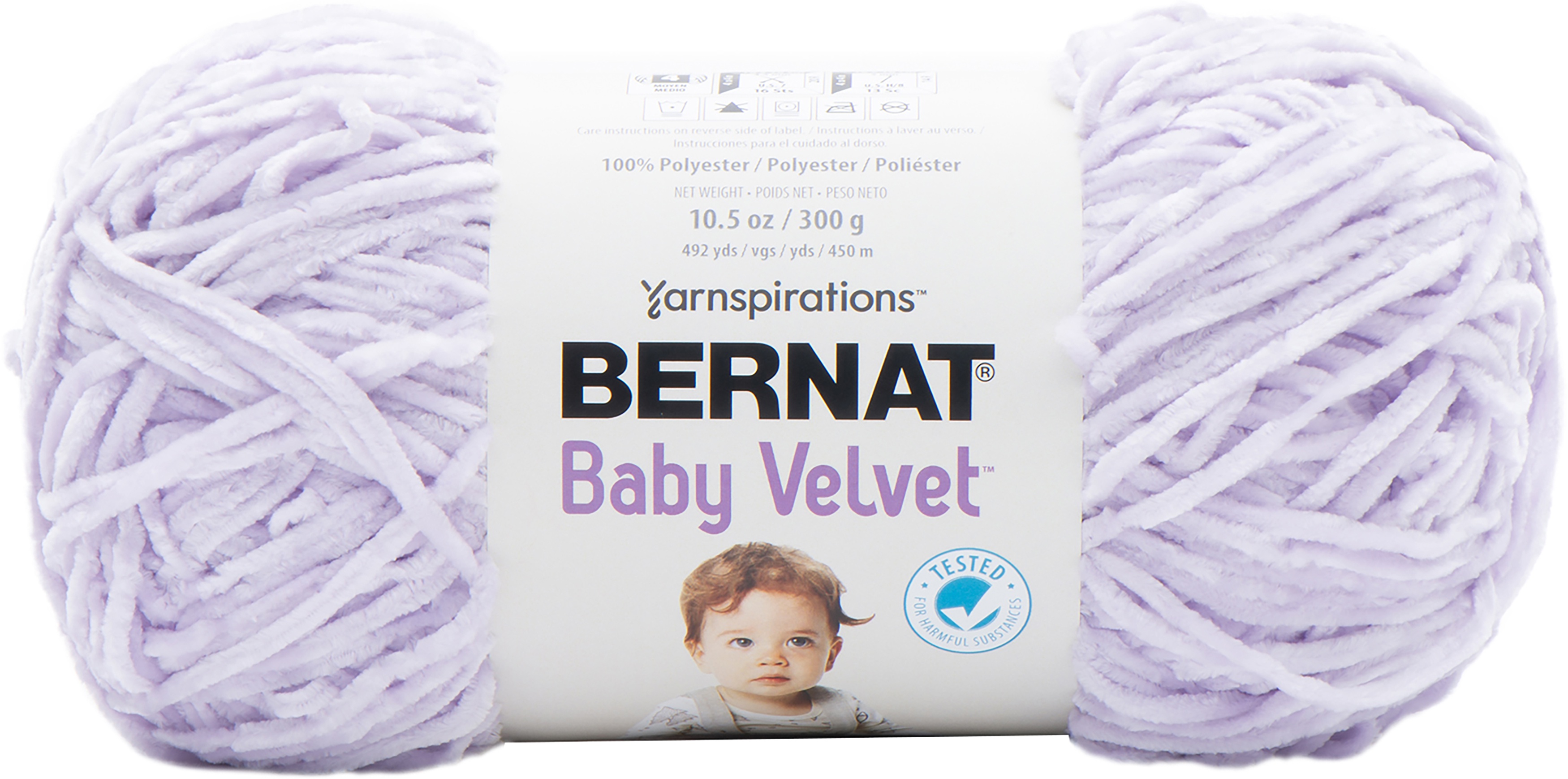 BERNAT-Baby Velvet. The Bernat Baby Velvet yarn is a luxuriously soft worsted weight yarn that is perfect for nursery projects. Its velvet texture doesn't pill or shed, creating machine washable projects that are a joy to stitch. From blankets to booties, you can get creative with knit and crochet patterns using this yarn. Weight category: 4. Content: 100% polyester. Putup: 10.5oz/300g, 492yd/450m. Gauge: 16sx14r = 4in/10cm on size US7/4.5mm knitting needles. Suggested crochet hook: USH8/5mm. Dyelotted: we try but are not always able to match dyelots. Machine wash and dry. Comes in a variety of colors. Each sold separately. Imported.
