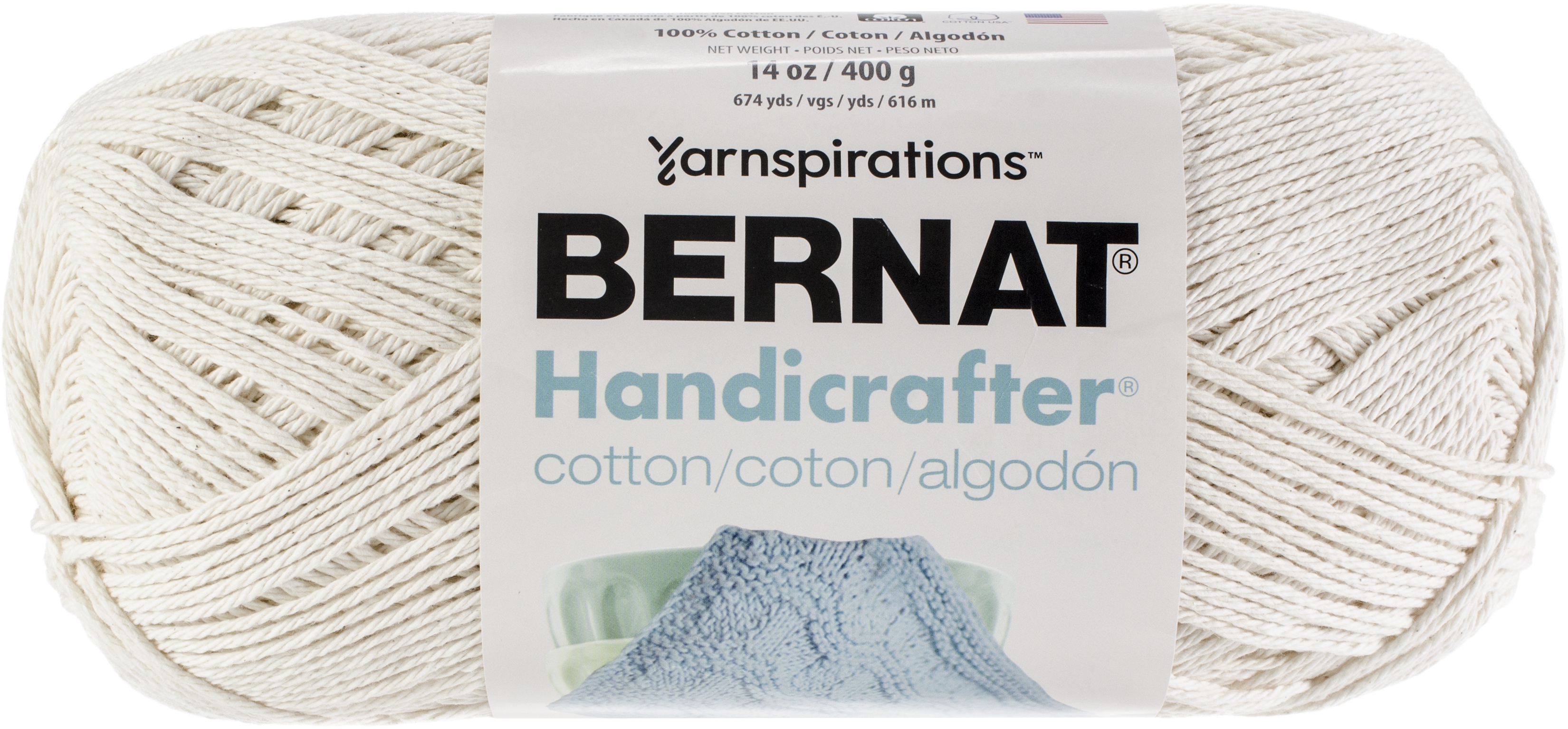 BERNAT-Handicrafter Cotton Yarn. This yarn is ideal for kitch accessories, baby bibs and home decor. Pattern on each label. Weight category: 4, 100% cotton. Solids: 14oz/400g, 710yd/650m. Ombres: 12oz/340g, 608yd/556m. Twists: 12oz/340g, 603yd/551m. Stripes: 9.8oz/280g, 470yd/429m. Gauge: 20s x 26r = 4in/10cm on size 7/4.5 knitting needles and H8/5mm crochet hook. Care: machine wash, tumble dry, do not bleach, do not iron. Imported.