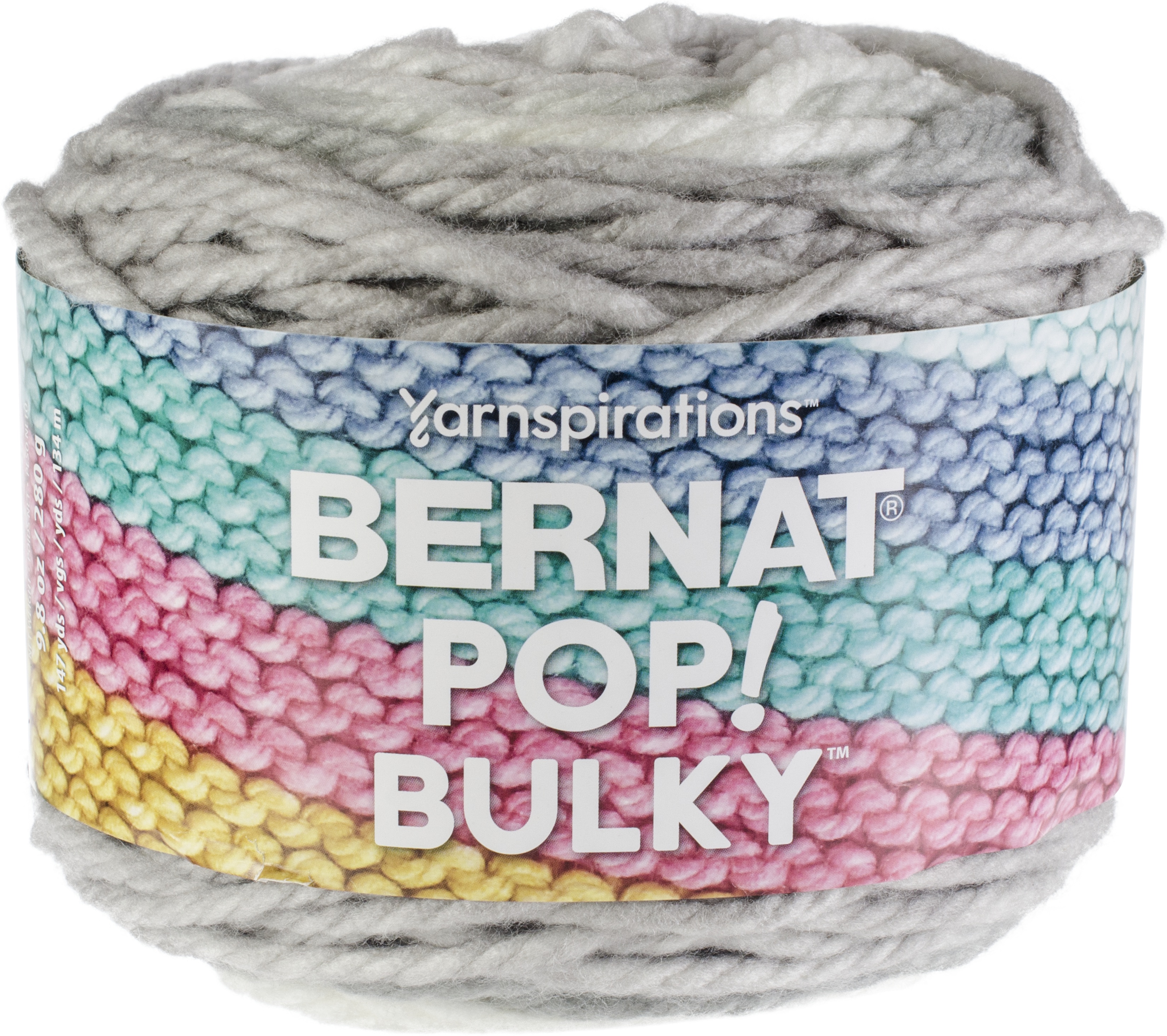 Bernat Pop! Bulky is the fast-stitching answer to your self- striping yarn needs! This machine washable and dryable yarn comes in a variety of bright shades, perfect for all kinds of projects, from home dec to accessories. Try out Bernat Pop! Bulky for your next project! Weight Category: 6. Content: 100% acrylic. Putup: 9.8oz/280g, 147yd/134m. Gauge: 8sx12r = 4in/10cm on size US15/10mm knitting needles. Suggested crochet hook size: N15. Dyelotted: we try but are not always able to match dyelots. Care: machine wash, machine dry, do not bleach, do not iron, do not dry clean. Comes in a variety of colors. Each sold separately. Imported.