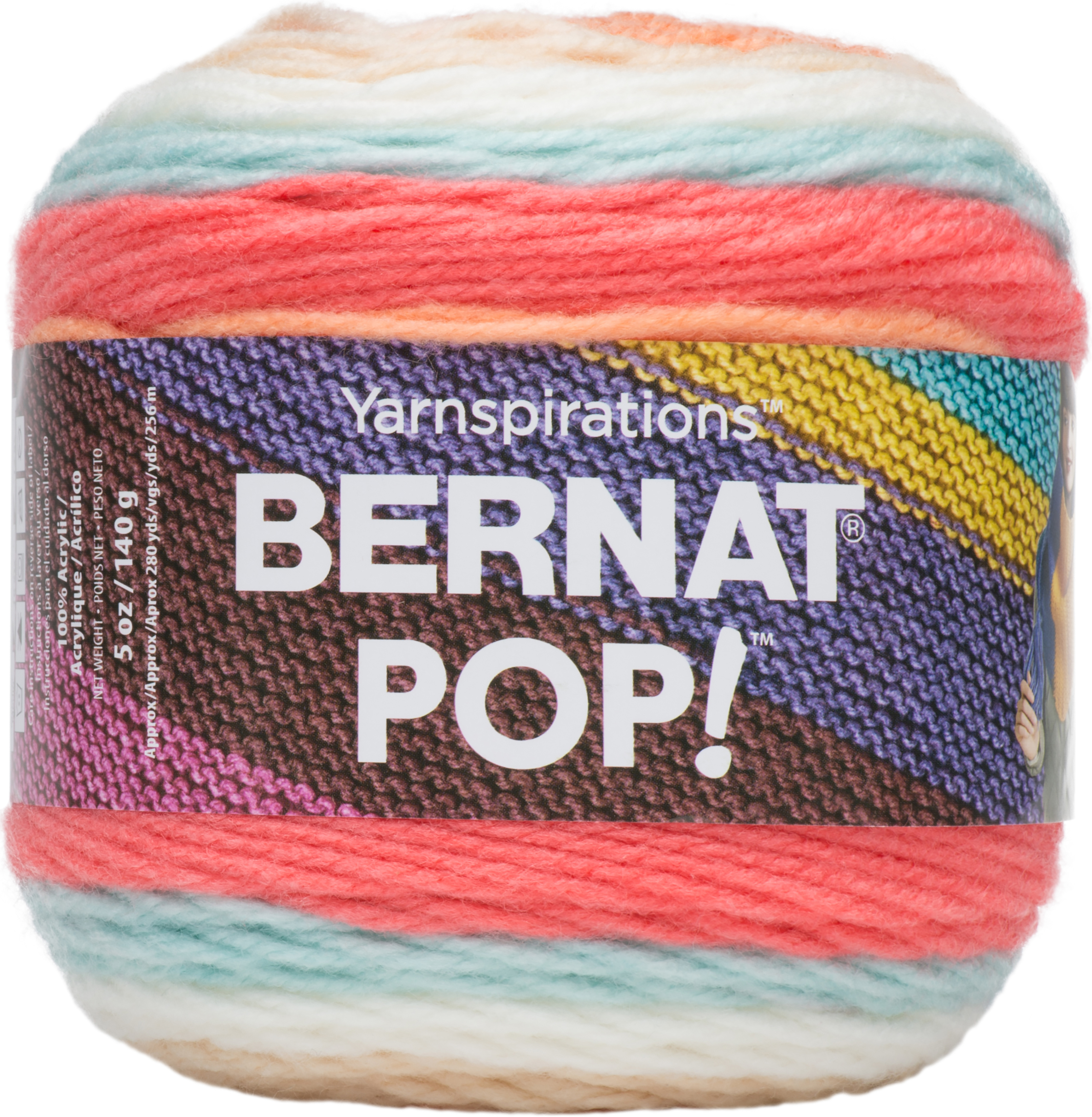 Bernat Pop is a 100% acrylic self-striping yarn that is sure to be a favorite! Feaaturing 26 distinct shades, you can create soft and durable striped projects without having to weave in any ends. Weight category: 4. Content: 100% Acrylic. Gauge: 5oz/140g, 280yd/256m. Gauge: 16sx20r = 4in/10cm on size US8/5mm knitting needles. Suggested crochet hook size H8. Dyelotted: we try but are not always able to match dyelots. Care: Machine wash and dry, do not bleach, do not iron, do not dry clean. Comes in a variety of colors. Each sold separately. Imported.