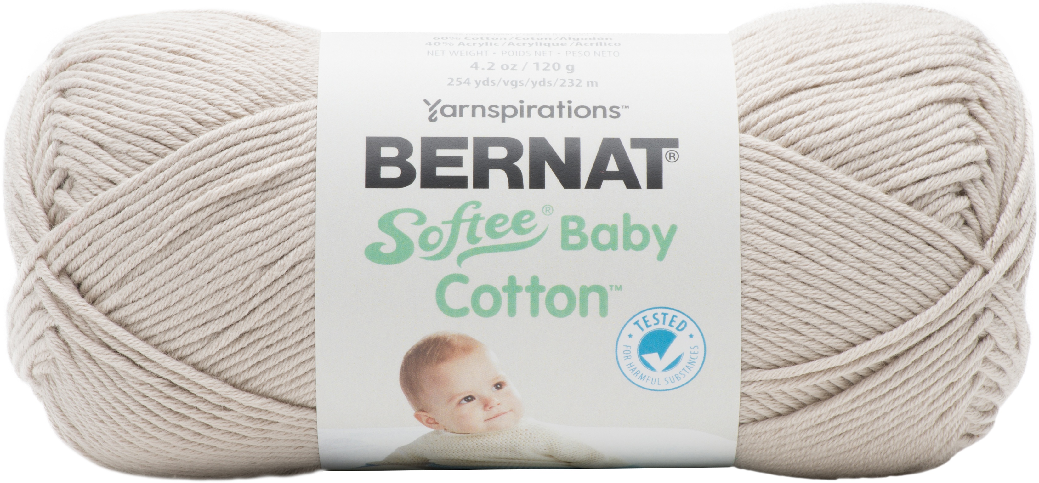 BERNAT-Softee Baby Cotton Yarn. Knit adorable baby apparel, blankets, accessories, and more with the Bernat Softee Baby Cotton Yarn. This baby yarn washes beautifully and gets softer with time. It's made of 60% cotton and 40% acrylic for enhanced strength and comfort. You can use this light yarn to make year-around baby sewing projects. Easy to care for, this cotton-blend yarn is machine-washable and dryable. Weight category: 3. 60% cotton, 40$ acrylic. 4.2oz/125g, 254yd/232m. Gauge: 22s x 28r = 4in/10cm on size US6/4mm knitting needles. 22sc x 28r on G6/4mm crochet hook. Care: machine wash warm water, tumble dry low heat. Comes in a variety of colors. Each sold separately. Imported.