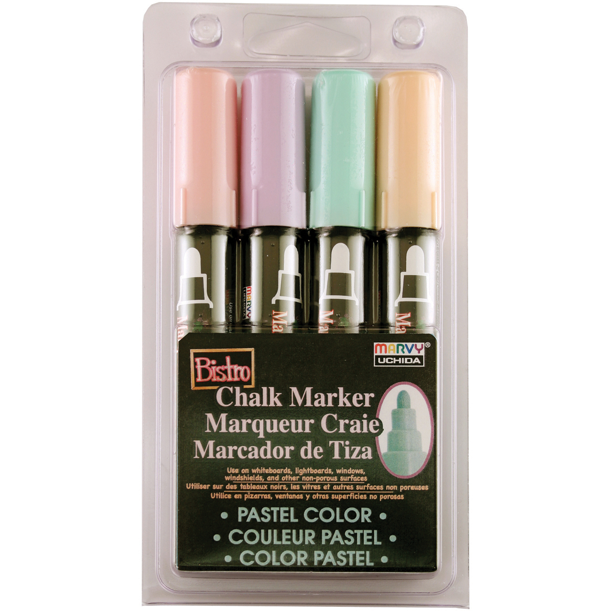 Use Bistro Chalk Markers on chalkboards, light boards, windows and windshields. They are opaque, water-based, pigmented and erasable when dry. This 3.75x7 inch package contains four markers in assorted colors. Non-toxic. Conforms to ASTM D4236. Imported.