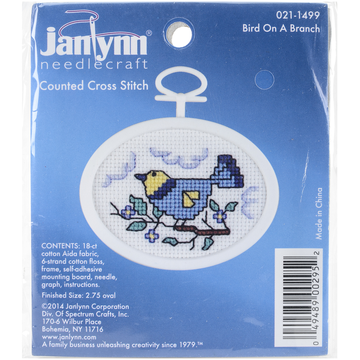 Janlynn-Mini Counted Cross Stitch Kit. Creative designs and quality products are put in to each of Janlynn's kits! This package contains 18-count cotton Aida fabric, 6-strand 100% cotton floss, one stitching frame, one self-adhesive mounting board, one needle, one graph and instructions. Design: Bluebird. Finished dimensions: 2-3/4x2-3/4 inches. Imported.