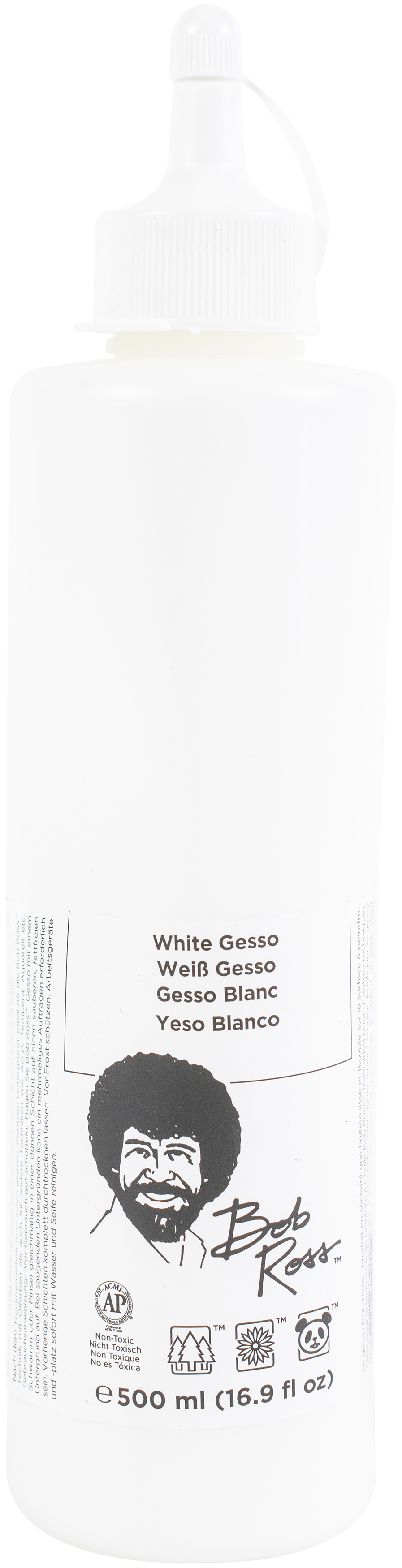 MARTIN/F. WEBER-Bob Ross Gesso. Bob Ross products are manufactured with care, from the finest materials. They are individually evaluated for quality and performance so novices and experienced painters alike can achieve optimum results in the wet-on-wet painting technique. Bob Ross Gesso contains pure pigments formulated in a 100% acrylic polymer emulsion which when dry produces a smooth, flexible, flat finish on artwork surfaces. It is ideal for the Bob Ross painting techniques with oil colors as well as other art media including acrylics, tempera, watercolors, ink, pencil, and more! This package contains one 473mL bottle of Gesso. Available in either White or Black: each sold separately. Conforms to ASTM D4236. Made in USA.
