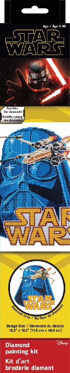 Its like paint by numbers but with multi-facet dots. Quick easy andfun to do. Just use the stylus to pick up a dot and place it into thematching square on the sticky print. This package contains ahigh-quality colour printed fabric, DIAMOND DOTZ(R) pre-sorted byshade, craft tray, stylus, soft grip & wax, and complete pictorialinstructions. Finished Size: 14.5x12.6 inches. Design: Vader &X-Wing. Imported.