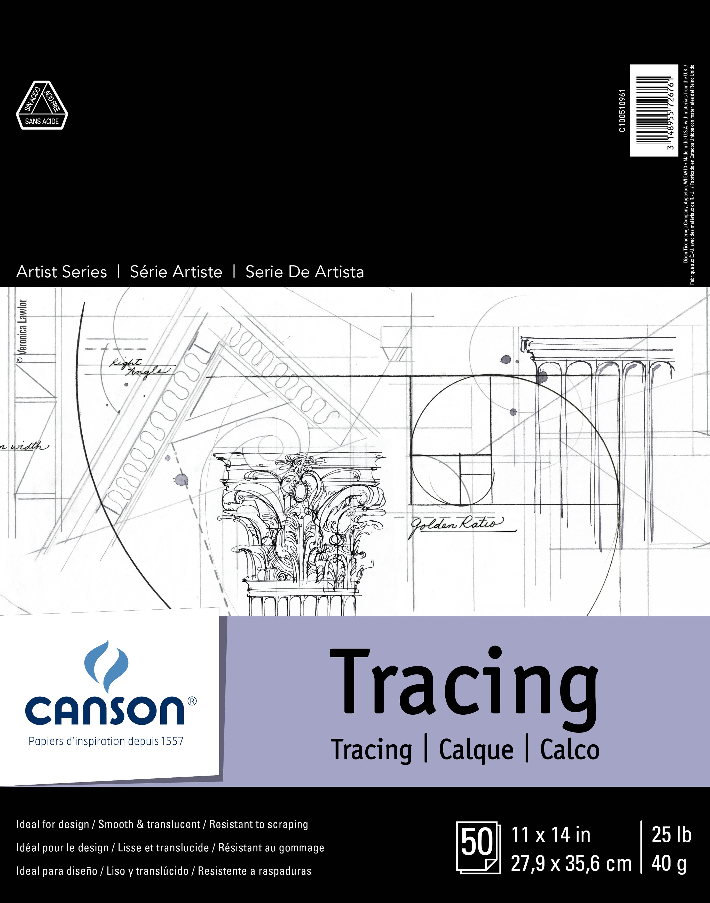 CANSON-Tracing Paper Pad. This tracing paper is exceptionally transparent and has a smooth surface suitable for pencil, ink, and markers. This package contains one 11x14 inch pad with fifty sheets of 25lb tracing paper. Acid free. Made in USA.