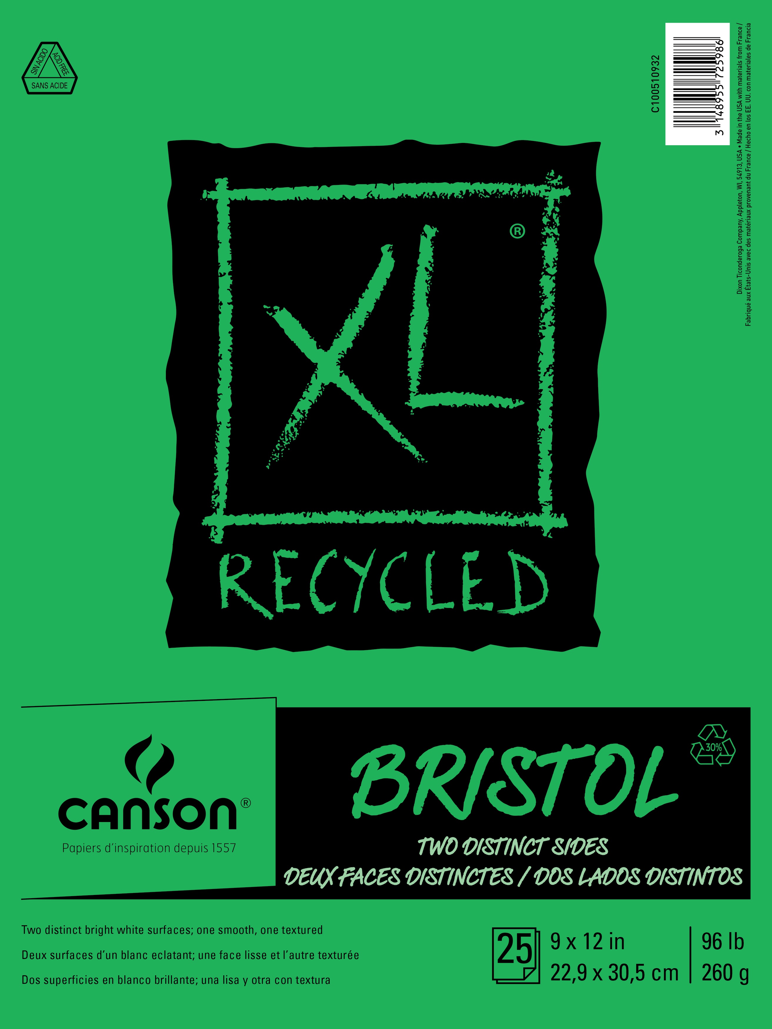 CANSON-XL Recycled Bristol Pad. This paper pad features two distinct bright white surfaces: one smooth and one textured. Bristol board accepts many types of media. This package contains one 12x9 inch recycled Bristol pad with twenty-five double-sided sheets. Acid free. Made in USA.