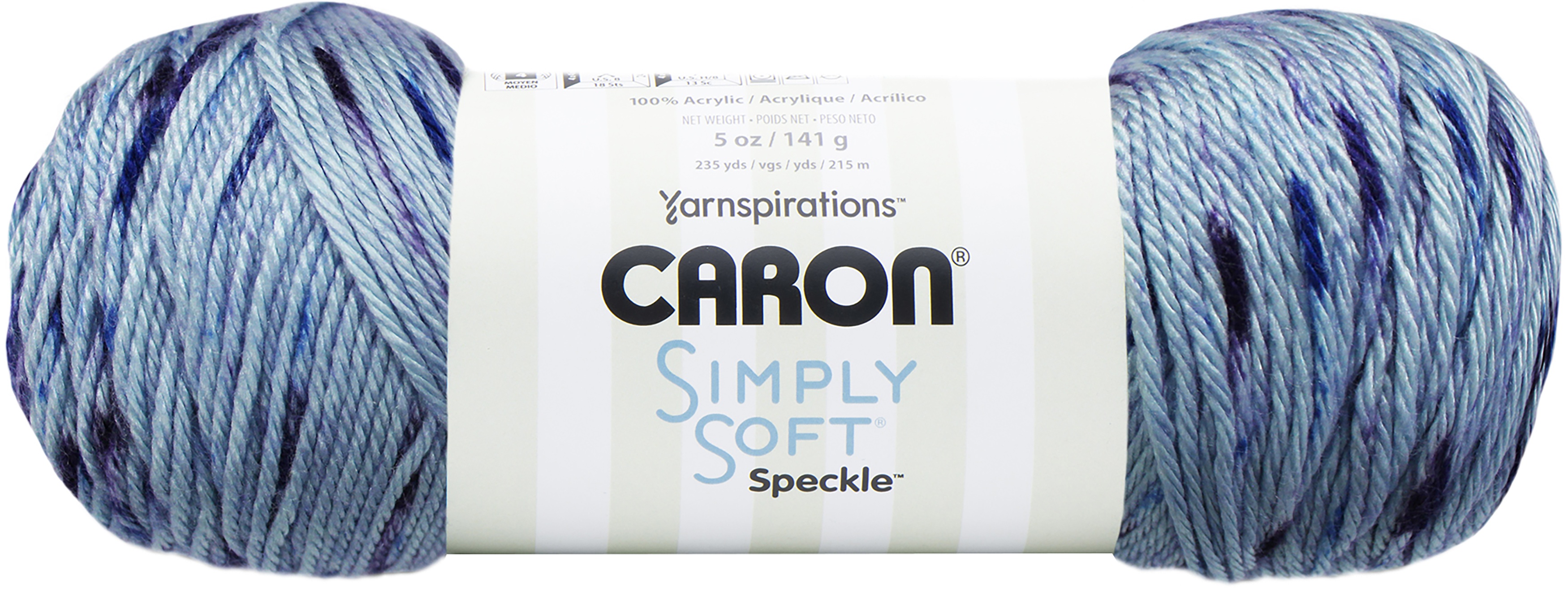CARON-Simply Soft Speckle. Caron Simply Soft Speckle is the same Simply Soft yarn you know and love, now with gorgeous speckled pops of color. This yarn is perfect for all your knit and crochet projects with beautiful drape and sheen that Simply Soft is known for. Weight category: 4. Content: 100% acrylic. Putup: 5oz/141g, 235yd/215m. Gauge: 18sx24r = 4in/10cm on size US 8/5mm knitting needles. Suggested crochet hook: USH8/5mm. Dyelotted: we try but are not always able to match dyelots. Care: Machine wash and dry. Comes in a variety of colors. Each sold separately. Imported.