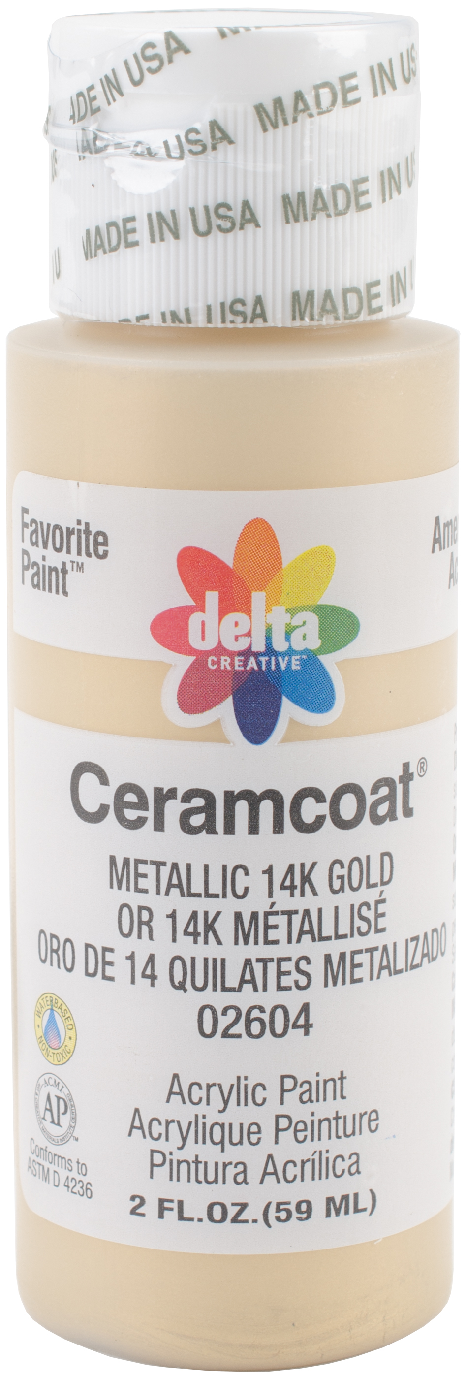 DELTA-Ceramcoat Acrylic Paint. This high quality acrylic paint comes in a vast palette and is perfect for use on wood, plaster, terra cotta, paper, chipboard, paper mache, tin, plastic and most other hard surfaces. This package contains one 2oz/59ml plastic bottle. Conforms to ASTM D4236. Made in USA. minutes, is easily cleaned up with soap and water while still wet. This package contains one 2oz/59ml shatterproof bottle of non-toxic acrylic paint. Conforms to ASTM D4236. Made in USA.