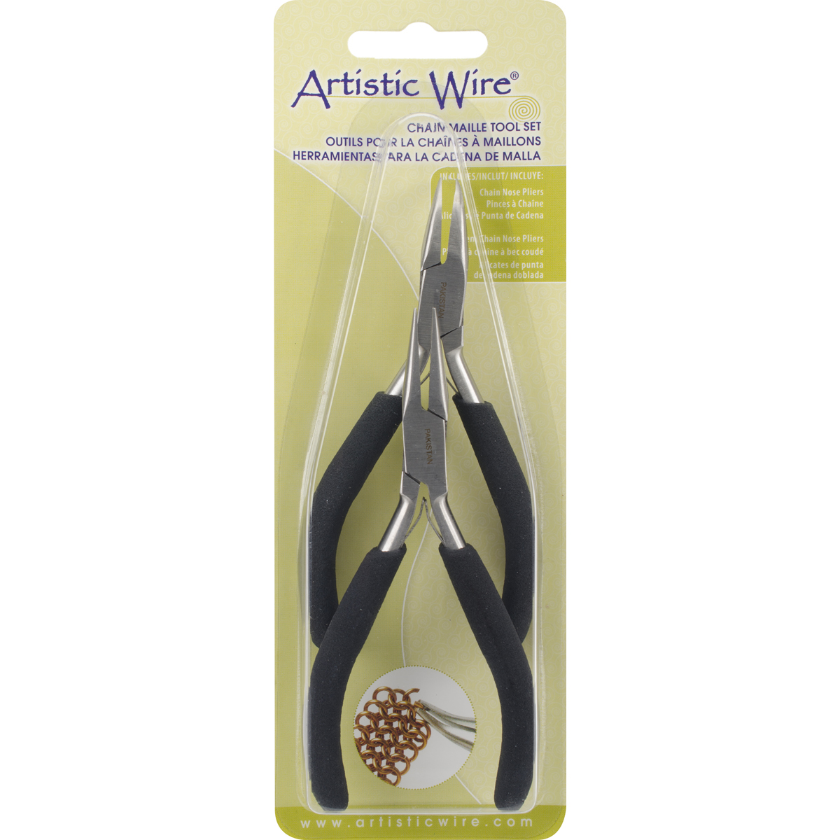 BEADALON-Artistic Wire: Chain Maille Tool Set. A handy two-piece set of pliers specifically for crafters! These stainless steel pliers feature cushioned comfort handles, box joint construction, and double leaf springs. This package contains two 4-1/2 inch long pliers: one chain nose plier and one bent nose plier. Imported.
