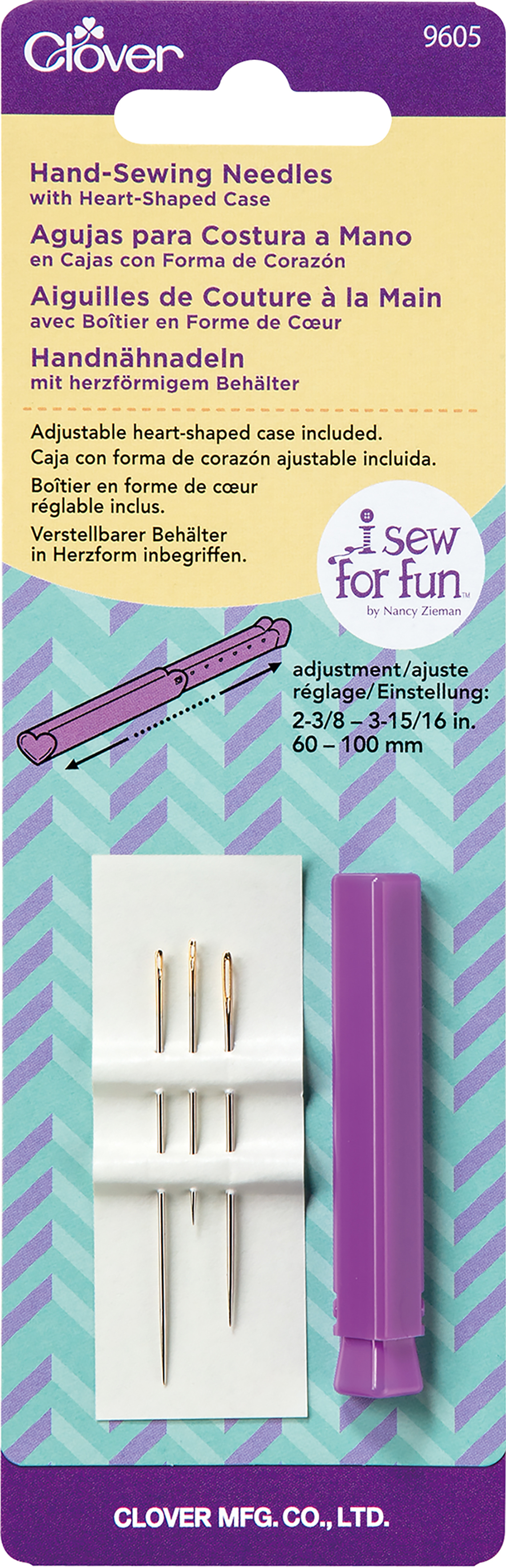 These hand sewing needles are perfect for normal fabrics, heavy weight fabrics and big stitch or embellishments. This 2.5x7.25 inch package contains three hand sewing needles and one adjustable heart-shaped case. Imported.