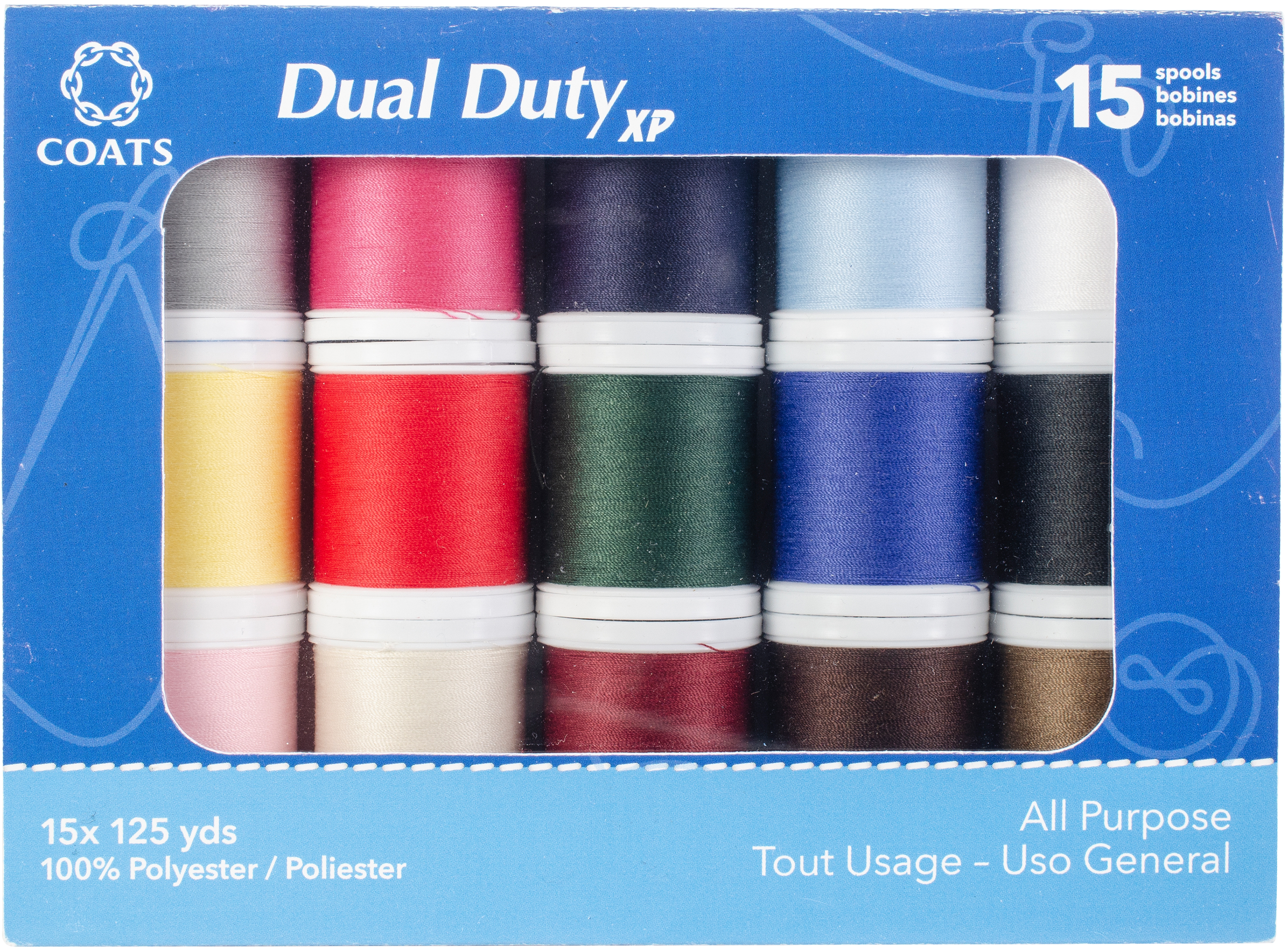 Coats-Dual Duty XP Thread Collection. This 15 spool collection of all-season colors comes in a peggable box for easy display. Each spool is 125 yards. This is a great basic color starter pack. Imported.