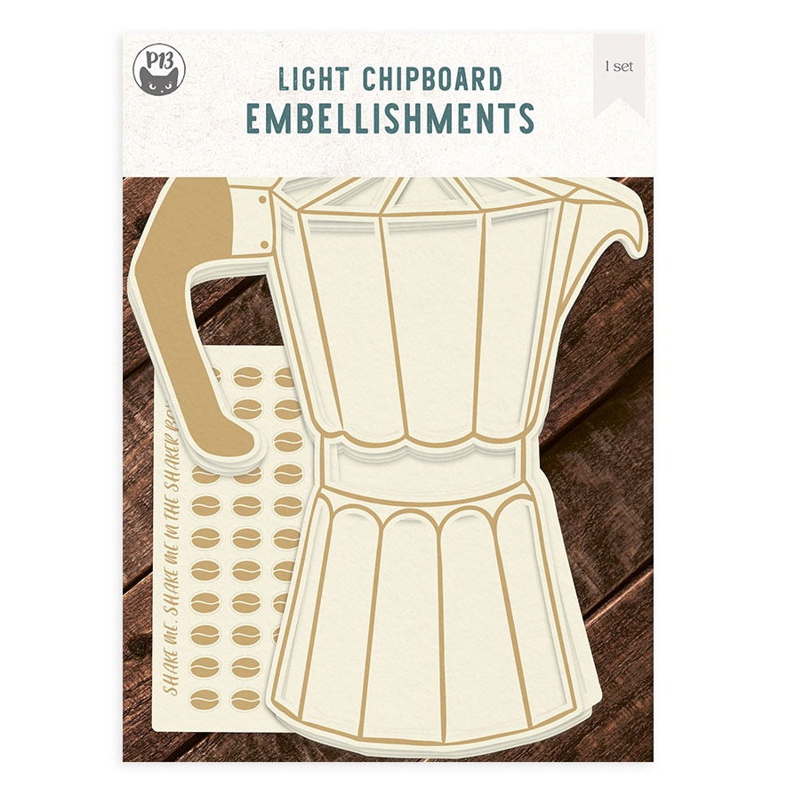 Light chipboard coffee maker shaker base with coffee beans filling.Perfect for a summer projects! It can be covered with paper, coloured using paints, inks, heat embossing or by applying waxes and structural pastes. Material may break when exposed to moisture, be careful while using water-based media. Imported.