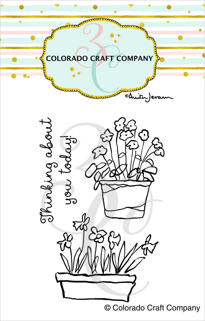 Spread seeds of happiness with the Thinking About Mini Clear Photopolymer Stamp Set featuring the illustrations of Anita Jeram for Colorado Craft Company. The set includes clear photopolymer stamps with two pots filled with flowers. This 2.5 x 4.5-inch package includes the Thinking About Mini stamp set measuring 2 x 3 inches. It includes 3 stamps: 2 images and 1 sentiment: Thinking about you today! The largest stamp is 1.5 x 1.25 inches and the smallest stamp is 1.5 x 0.6 inches. The stamps can be used with the coordinating Thinking About mini die set sold separately (AJ791-D). Made in USA.