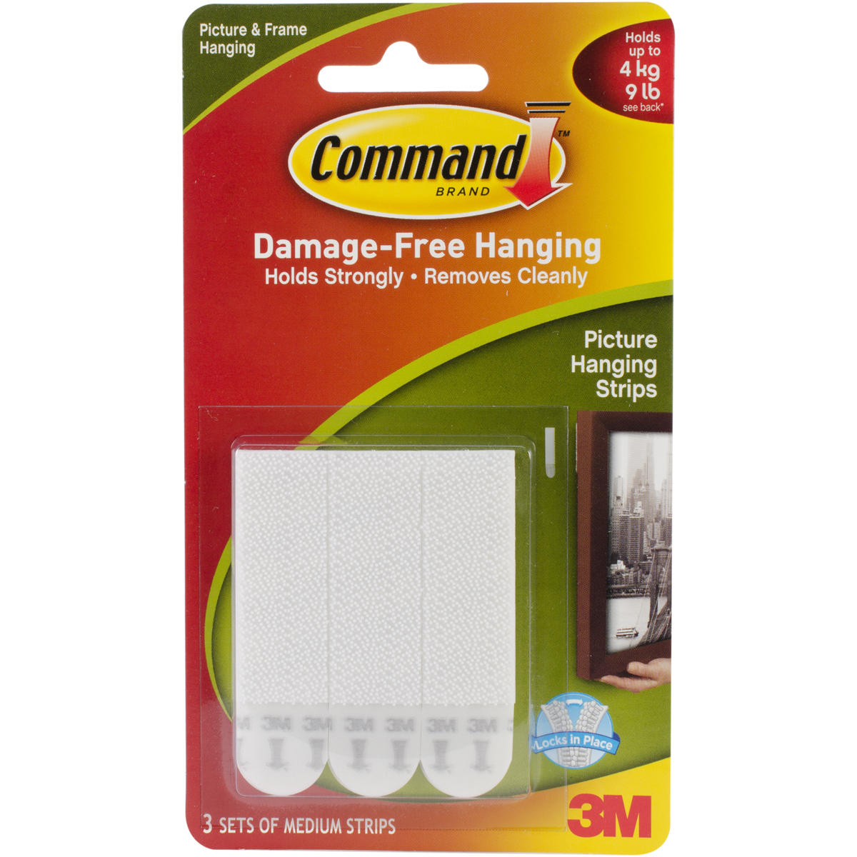 3M-Command Picture Hanging Strips. Command adhesive strips hold on strongly but come off cleanly leaving no damage or residue on the picture frame or wall! This package contains six (3 sets of two) adhesive picture hanging strips (2-3/4x3/4in) and instructions for use and removal. Not recommended for use on wallpaper. Six strips will hold most frames up to 12x16in. Made in USA.