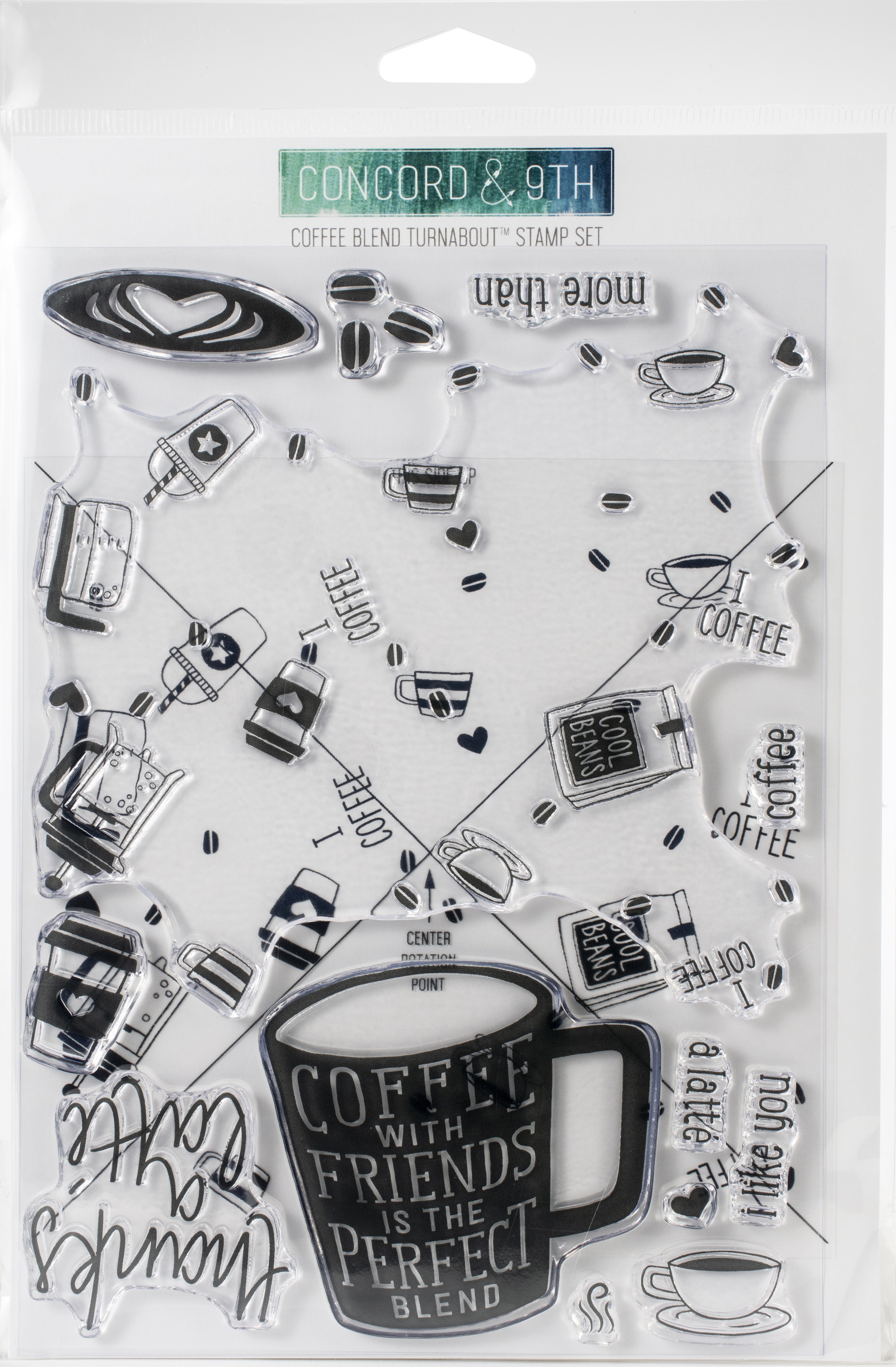 Add wonderful images and phrases to cards and more with these clear stamps! This package contains Coffee Blend Turnabout: a set of 13 clear stamps on one 5.75x8 inch backing sheet. WARNING: Choking Hazard. Not suitable for children under 3 years. Made in USA.