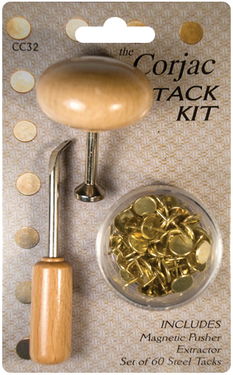 LACIS-Corjac Thumbtack Kit includes the Magnetic Tack pusher, a Tack Extractor, and a container of 60 steel tacks. Features a natural wood finish model of the popular tack kit for the placement of thumb tacks. The magnet holds tacks in place while pressure through your palm through a comfortable handle sets the tack just where you want it. Designed for ergonomic, easy application of tacks into tackable materials including wood frames for needle arts. Also accepts standard quilting tacks. Tool measures: 3.5 x 2 x 2 inches. Imported