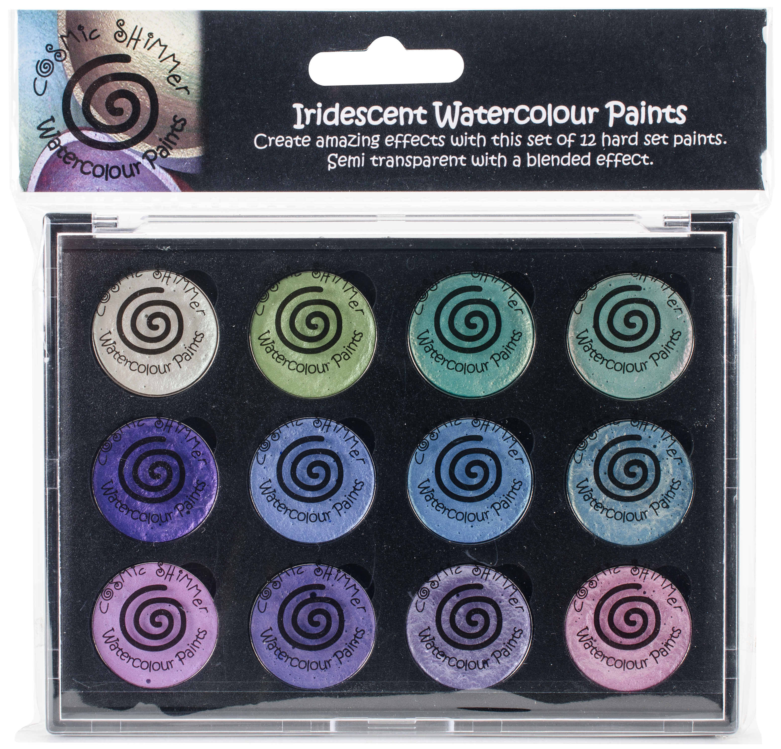 The set of 12 iridescent mica based shimmering watercolor paints are suitable for all types of craft projects and mixed media. This package contains 12 iridescent watercolor paints in assorted colors within one 5.75x4.25x.5 inch storage box. WARNING: Choking Hazard- small parts. Not for children under 3 years. Imported.