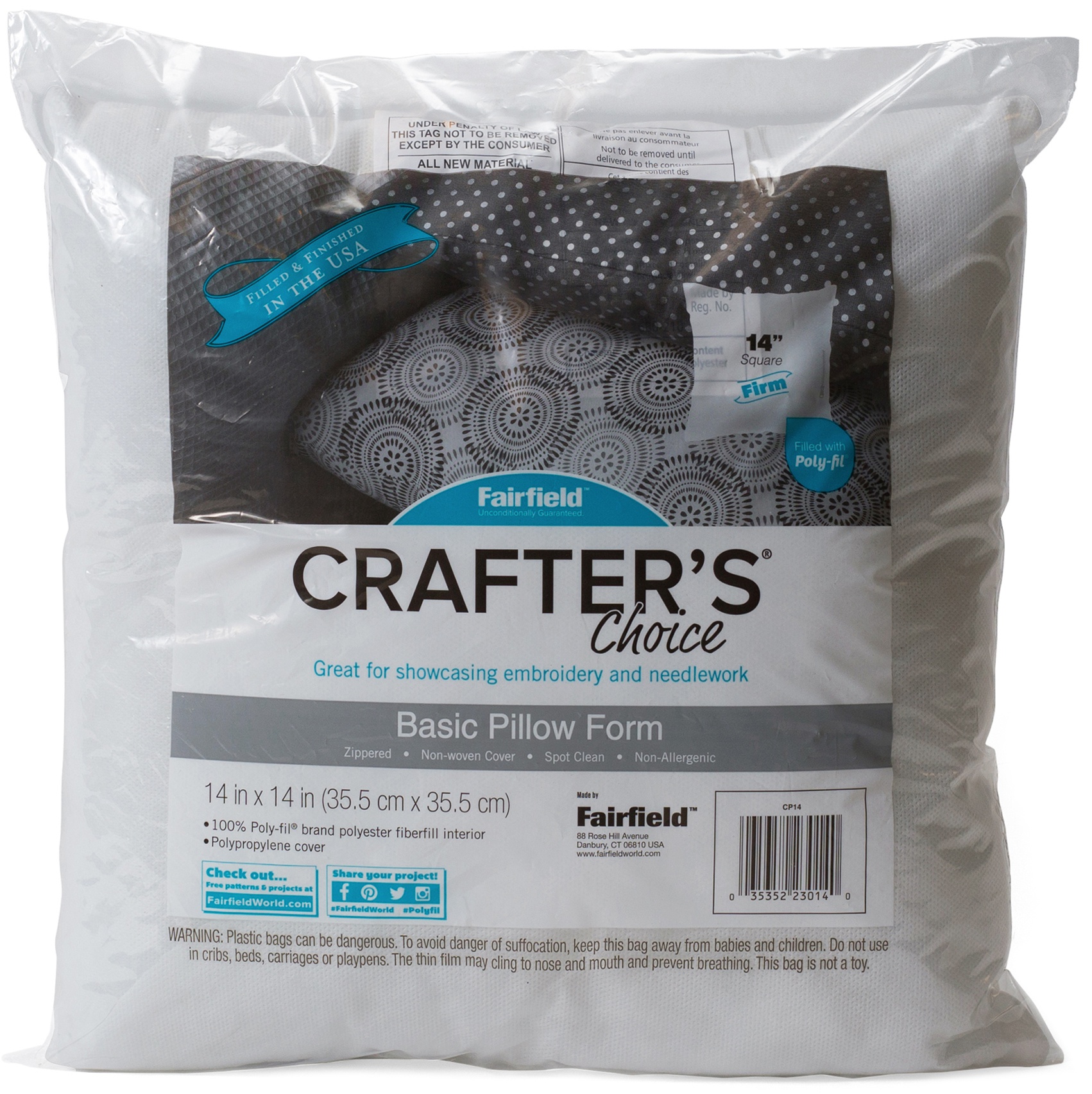 FAIRFIELD-Crafter's Choice Pillowform. This pillow insert features a polypropylene cover filled with 100% polyester. Also has a zipper on the side for adjusting firmness level by adding or removing fiberfill (extra fiberfill sold separately). This package contains one 14x14 inch pillow insert. Made in USA.