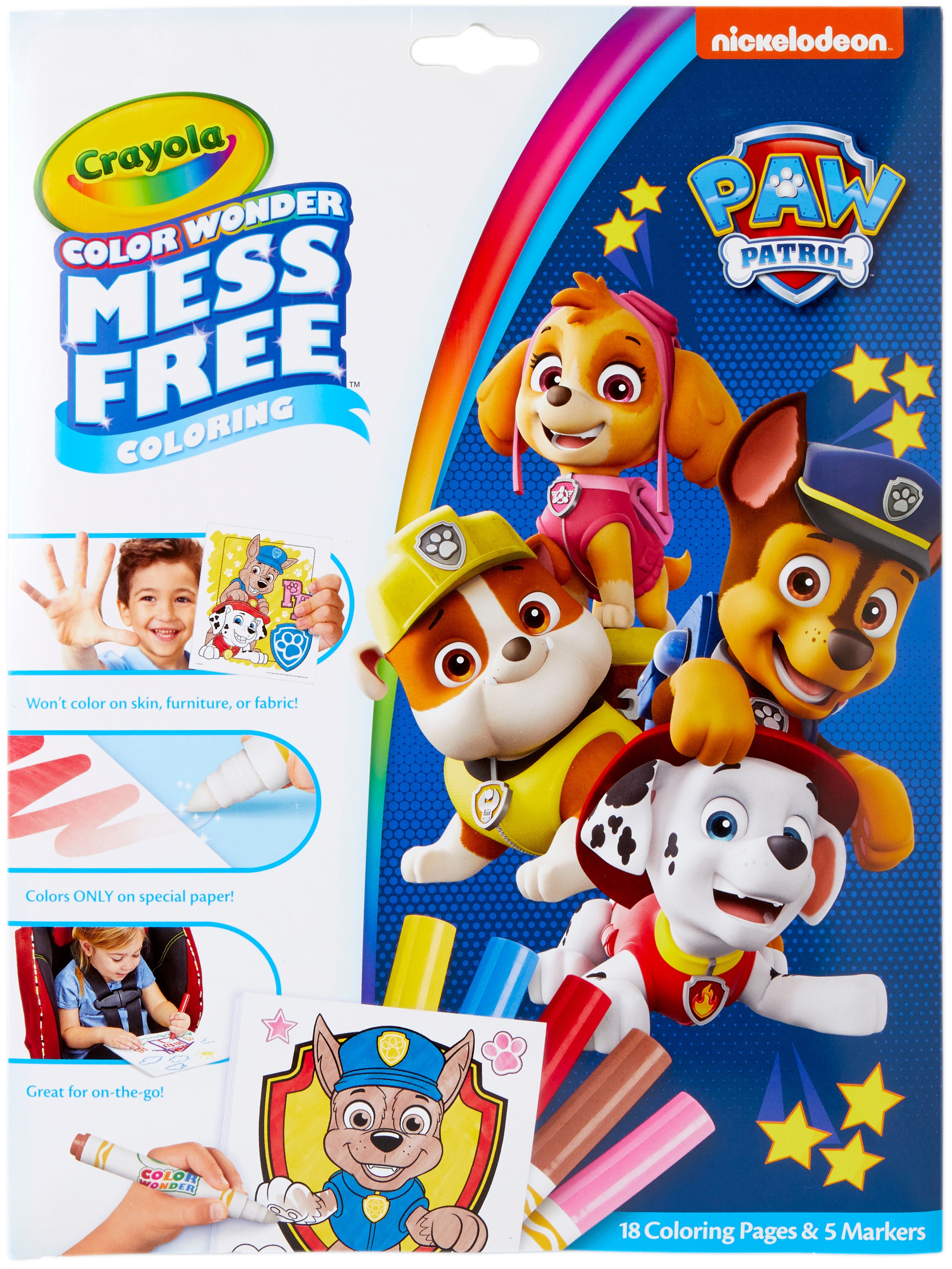 Keep the Color Wonder fun going with 18 mess-free coloring pages of Paw Patrol fun! Color Wonder markers work only on special paper. Won't color on skin, furniture or carpets. Also includes 5 Color Wonder Markers