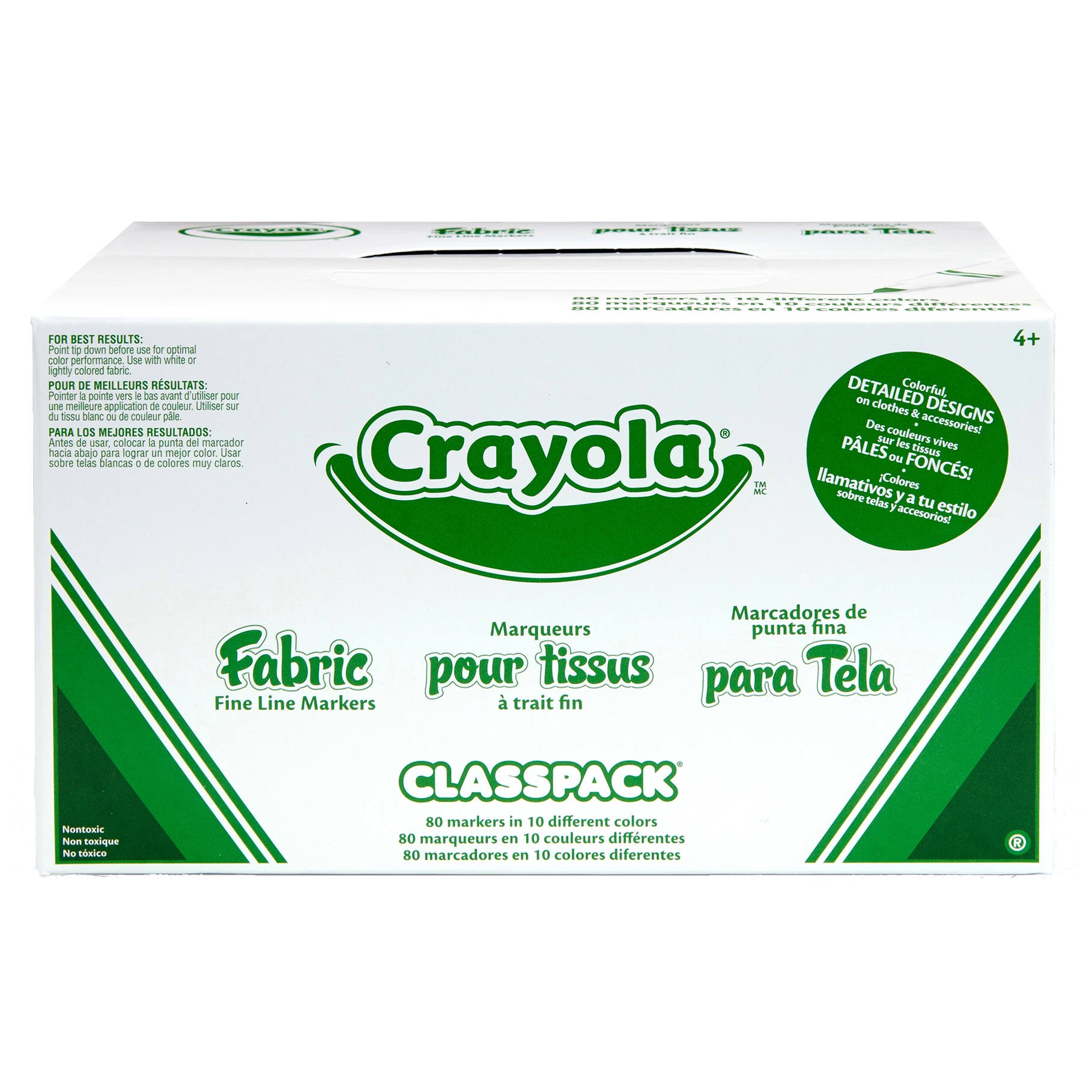 CRAYOLA-Design on fabric with 10 brilliant colors! Box includes 80 markers-8 each of 10 colors! Color are black, purple, red, royal blue, light blue, green, light green, yellow, red, orange, and brown. For best results, use on 50/50 cotton/polyester fabric. Place a piece of paper under the fabric to prevent bleed-through. Saturate the cloth with colors. Let items dry overnight. Before wearing or laundering, designs must be heat set. Non-Toxic. Made in USA.