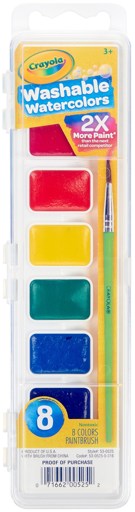CRAYOLA-Eight washable watercolors on a white tray. Includes 1 natural-hair brush. Non-toxic. Conforms to ASTM D4236.