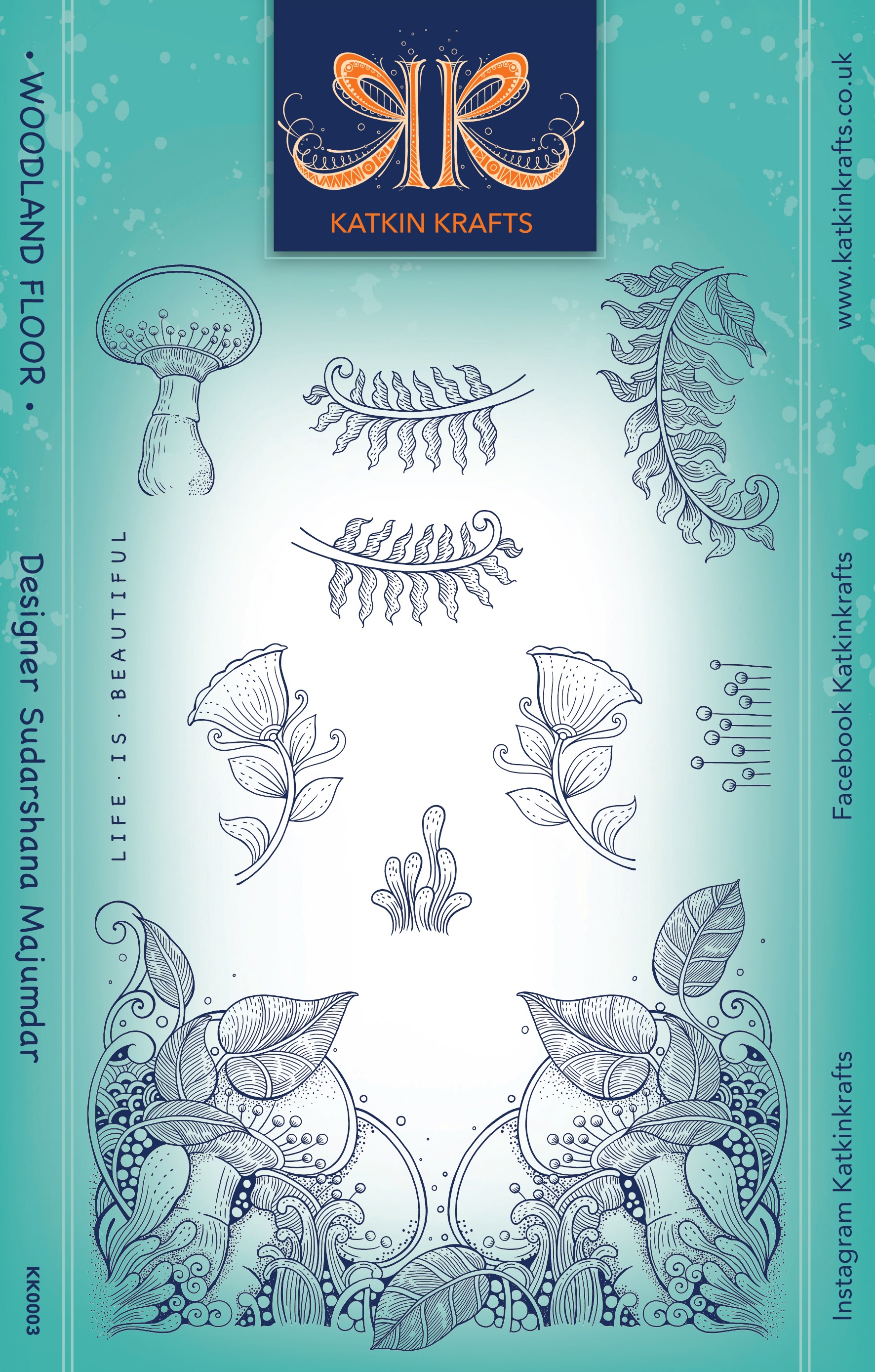 The Woodland Floor stamp set has a gorgeous collection of mushrooms as the main image together with smaller elements and a sentiment. Made from deep etched, quality photopolymer the stamps are ready to mount on an acrylic block (not included). The stamps can be used with ink pads, paint, or used with pigment and embossing powder. They are suitable for paper, fabric, or any other surface depending on the ink choice. You can also spritz the fabric with water after stamping but before heat sealing to create lovely watercolor background washes. Store flat away from heat and sunlight. This package contains Creative Expressions Clear Stamp Set by Katkin Krafts
