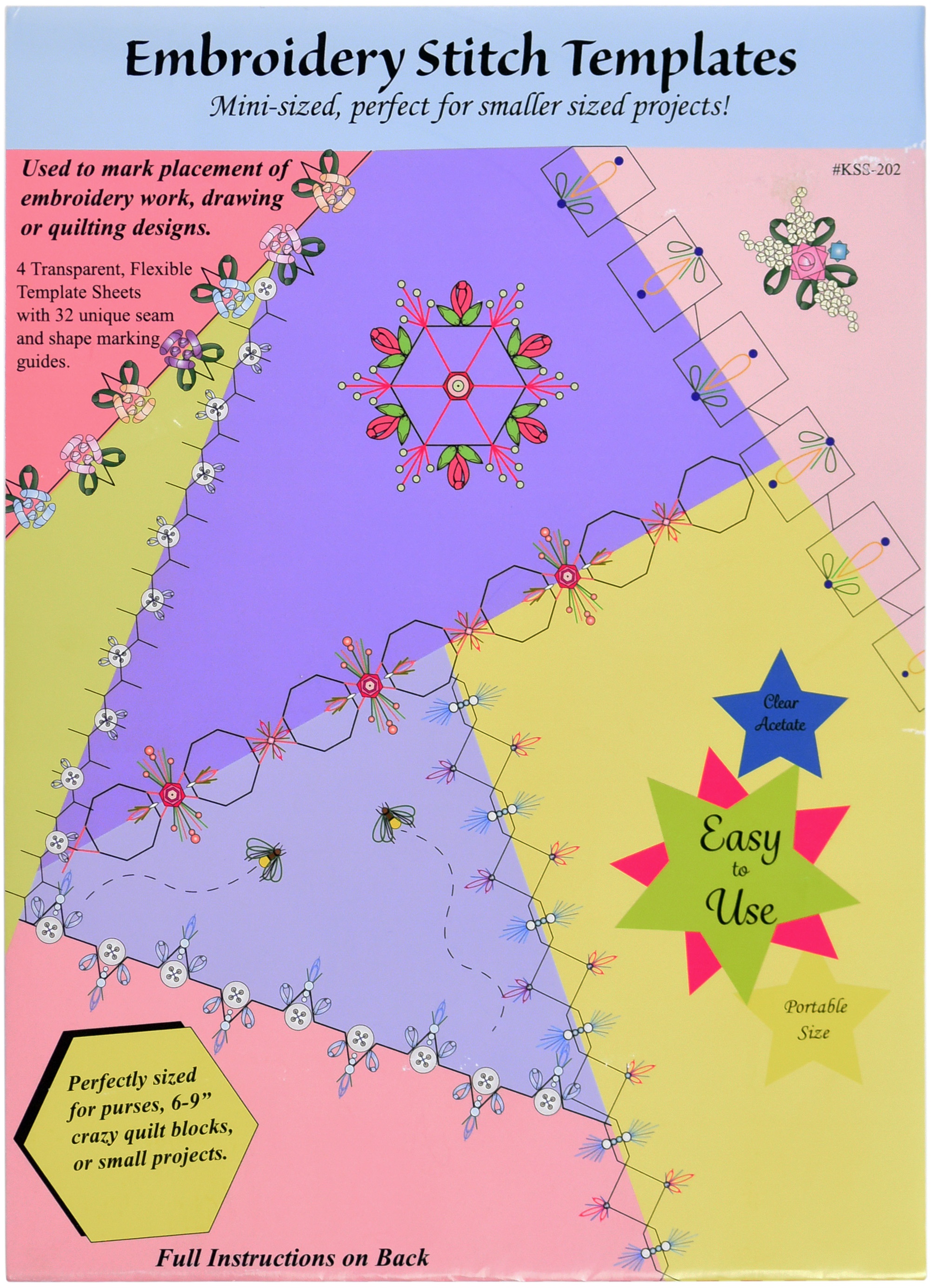 Mini-Sized and perfect for 6-9 inch quilt blocks or smaller sized projects like purses. These stitch templates can be used on any sewing, quilting or embroidery project where a beautiful hand-stitched embroidery designs is needed. They are versatile and easy to use, with the specific embroidery designs printed on the template and holes to make the precise needle-up/needle-down positions. The templates are made of a thin, durable transparent plastic. The set includes four 9x6 inch sheets. Includes easy-to-follow instructions. Just mark your project and then follow the dots! Getting perfectly aligned stitches on a variety of projects, from paper to fabric, has never been easier!