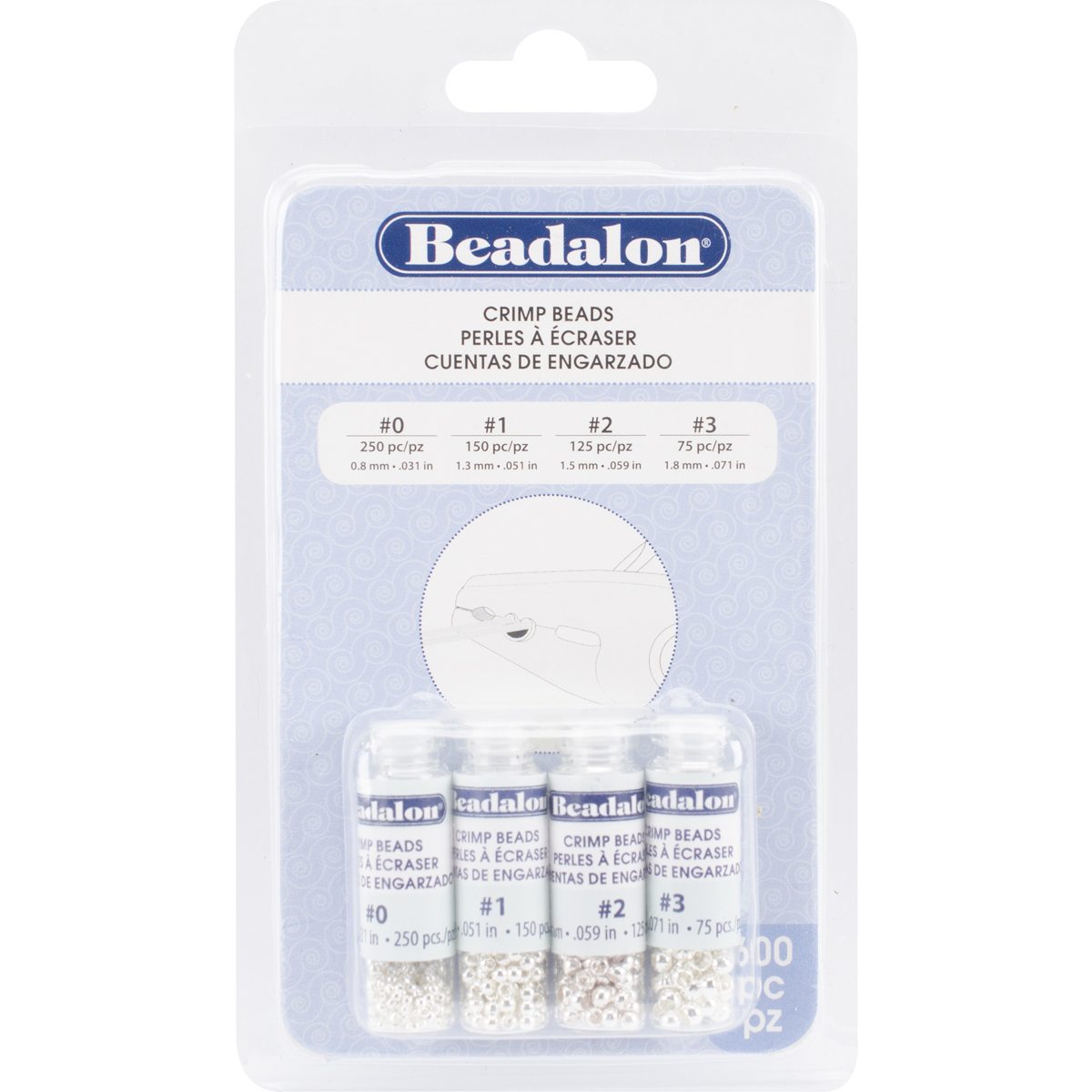 BEADALON-Crimp Beads. This package contains 600 silver plated crimp beads in assorted sizes for any home jewelry crafting project. Each size comes in a separate vial: 0, 1, 2 and 3. Imported.