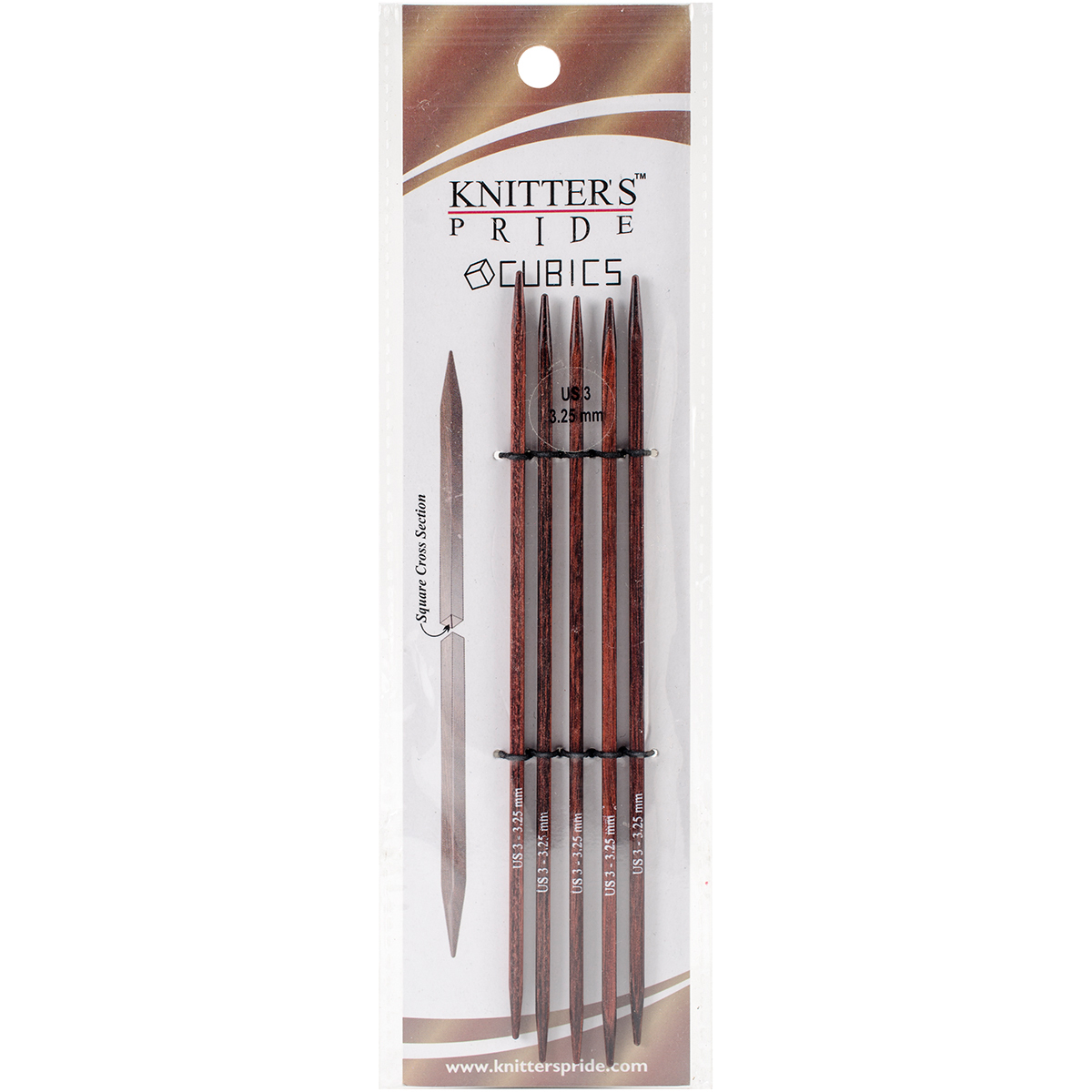 Knitter's Pride-Cubic Double Pointed Needles. The cuboid shape gives way to the perfectly tapered birch wood needle points. Cubics needles are elegant laminated Symfonie Rose wood that is rich in appearance, yet lightweight, strong and flexible. The unique ergonomic shape provides comfort to the hand and uniform stitch formation. Perfect for socks! Cubics are perfect for beginners with easy grip and control over your knitting. This package contains five 6 inch long double pointed needles in one size. Comes in a variety of sizes. Each sold separately. Imported.