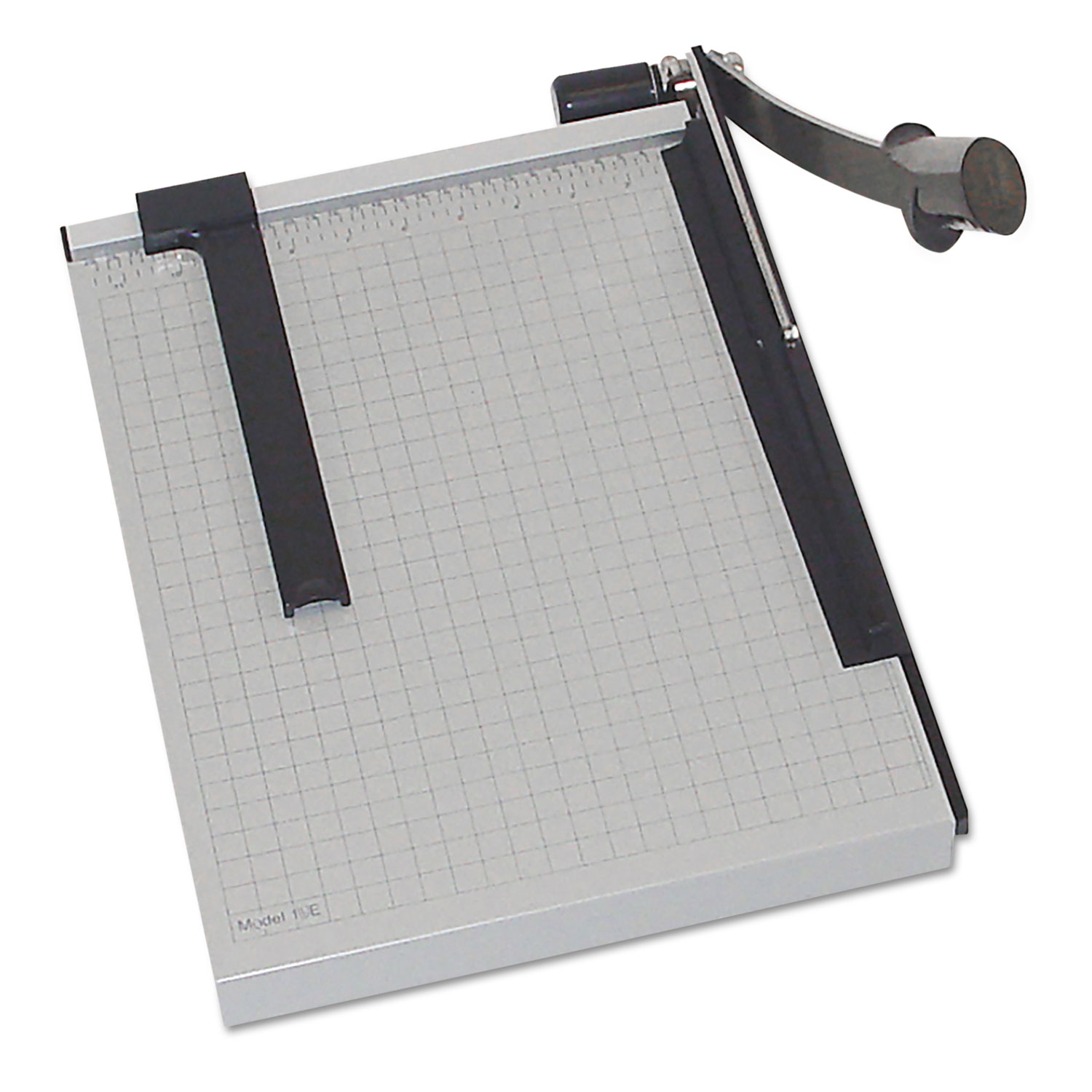 Designed to hold up to rigorous activity, day in and day out. The machine-ground, lever-style blade is sharp and accurate enough that it can remove even the tiniest sliver of paper from your work. For safety, a spring-action handle prevents the blade from falling down unexpectedly. Lightweight and marked with guides, Vantage® trimmers offer safety and convenience, while giving you the accuracy you require. To ensure an even cut, each trimmer features an automatic clamp that provides firm, even pressure, preventing paper from shifting. To protect the blade and keep fingers safe, the handle can be locked in the down position. For durability, the sturdy metal base provides a solid foundation. For measuring, the base contains carefully screened guides and an adjustable backstop -- which is the easiest way to ensure accuracy during repetitive cuts. And for portability, it's designed to be light enough to take anywhere. Trimmer Board Type: Guillotine; Sheet Capacity: 15; Cut Length: 18"; Blade Material: Metal.