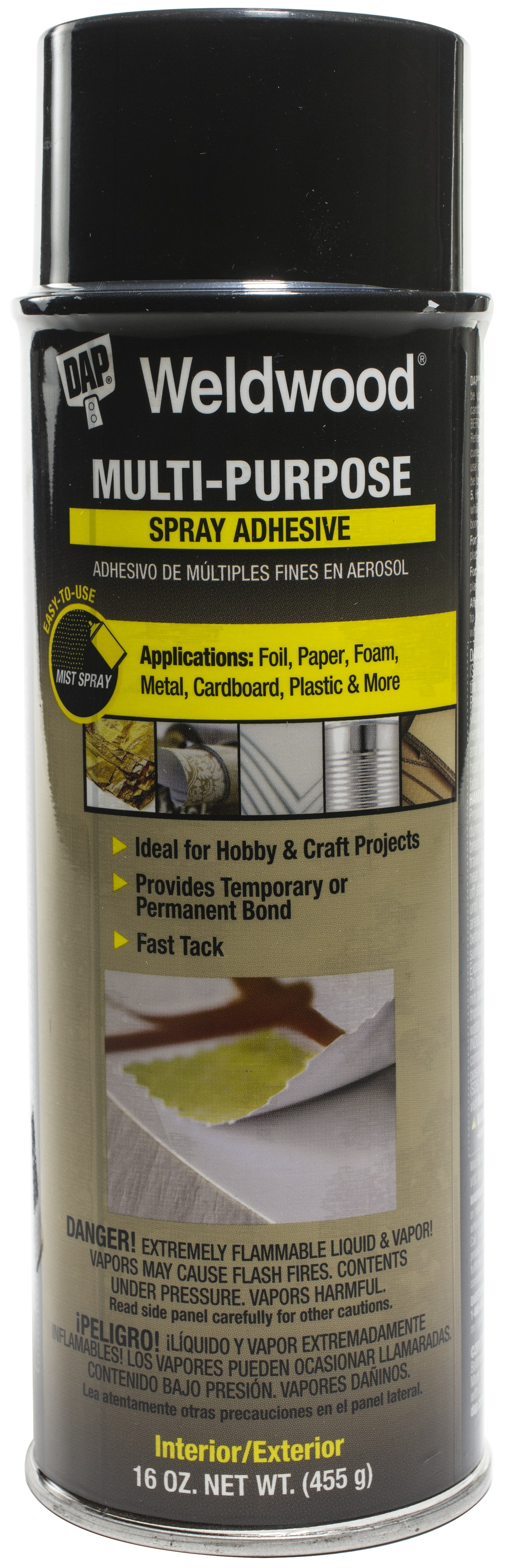 This multipurpose adhesive offers a temporary or permanent bond for trim, upholstery and craft pieces. This package contains 16oz of interior/exterior spray adhesive. WARNING: Extremely Flammable. Contents under pressure. WARNING: This product contains chemicals known to the state of California to cause cancer, birth defects or other reproductive harm. Do not mouth or chew. Made in USA.