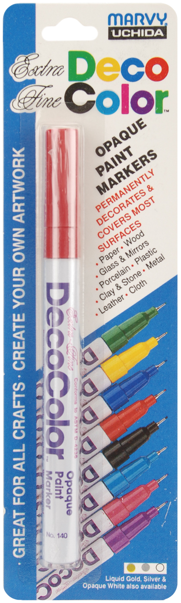 MARVY UCHIDA-Deco Color Extra Fine Point Opaque Paint Marker. Great for crafting at home, school and the office. These Extra Fine paint markers are great for writing and detail drawings on glass, paper, wood, clay, porcelain, stone, metal and mirrors. The paint is opaque, xylene based, lead free, acid free, lightfast, oil-based, weatherproof and exclusive pure pigmented brilliance. Available in a variety of colors. Conforms to ASTM D4236. Imported.