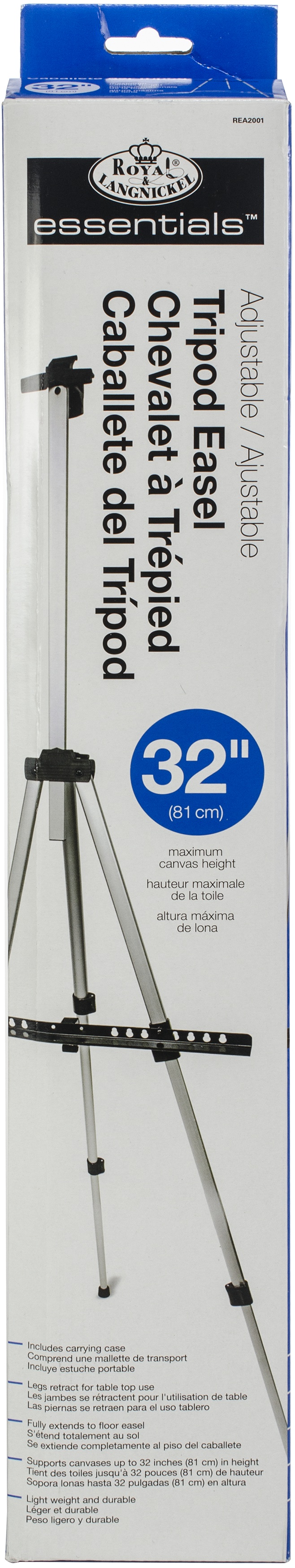 ROYAL LANGNICKEL-Aluminum Easel. This aluminum easel adjusts to accommodate pads and boards from 7in to 32in high and features three independent adjustable legs (17in to 46in) allowing you to easily use it on uneven surfaces, as well as in cramped quarters: going so far as allowing placement of one or two legs on a desk, table, bench, wall or other elevated surface and the remaining foot (feet) on the floor/ground. Canvas can be lowered as low as 30in from the floor, making it great for kids! Easel measures approximately 62x41x28in (folded: 4x24x3in) with its own carry case. Imported.