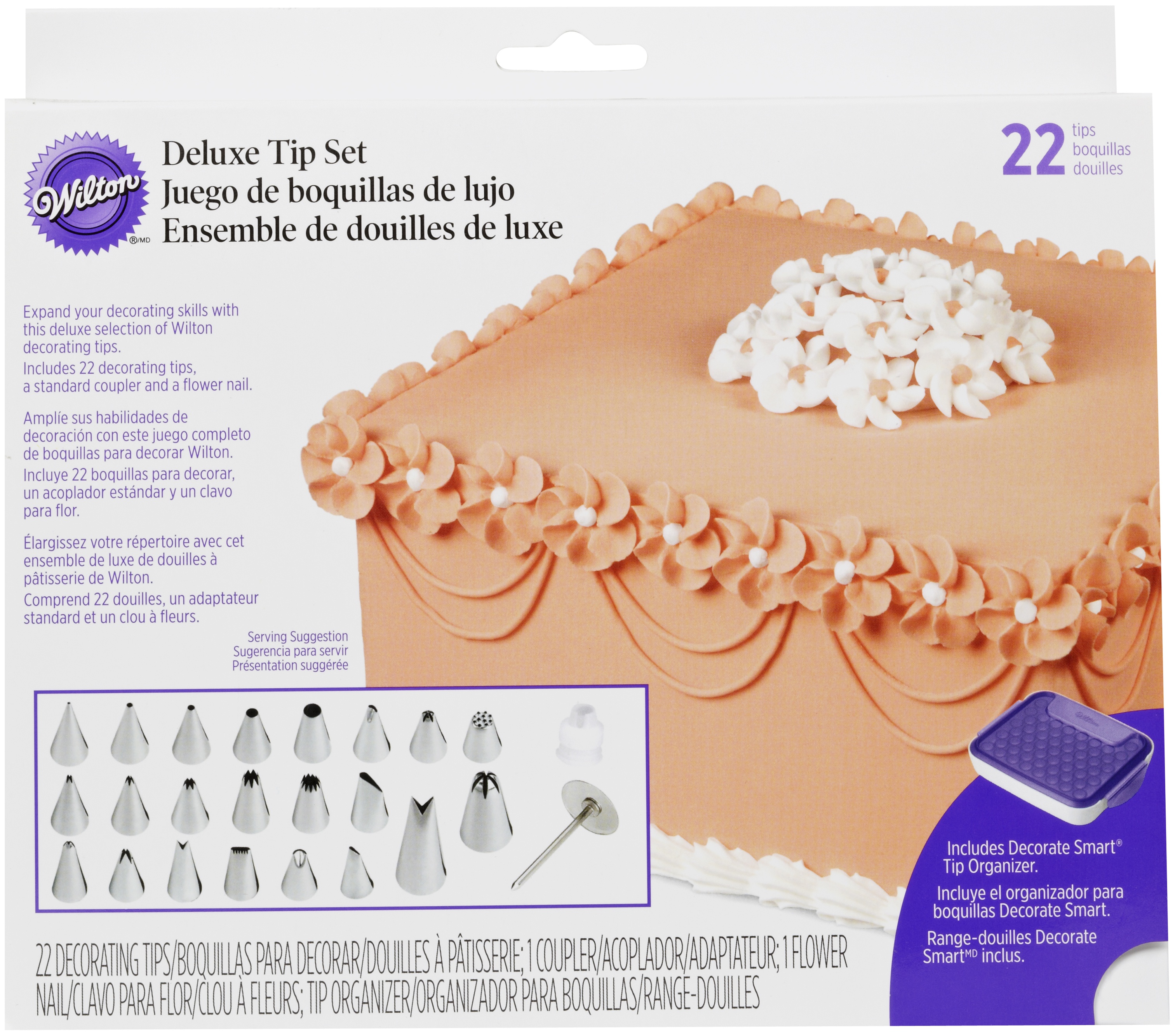 WILTON-Deluxe Decorating Tip Set. You can expand your decorating skills with this deluxe selection of Wilton decorating tips! You can choose from twenty-two unique tips for your decorating! Includes: #s 1,3, 5, 8, 12, 14, 16, 18, 21, 32, 59s, 101, 104, 224, 2D, 233, 47, 352, 366, 67, 74 and 81. This package contains one 8x6-1/2x1-3/4 inch tip organizer, twenty-two stainless steel decorating tips, one coupler and one flower nail. Imported.
