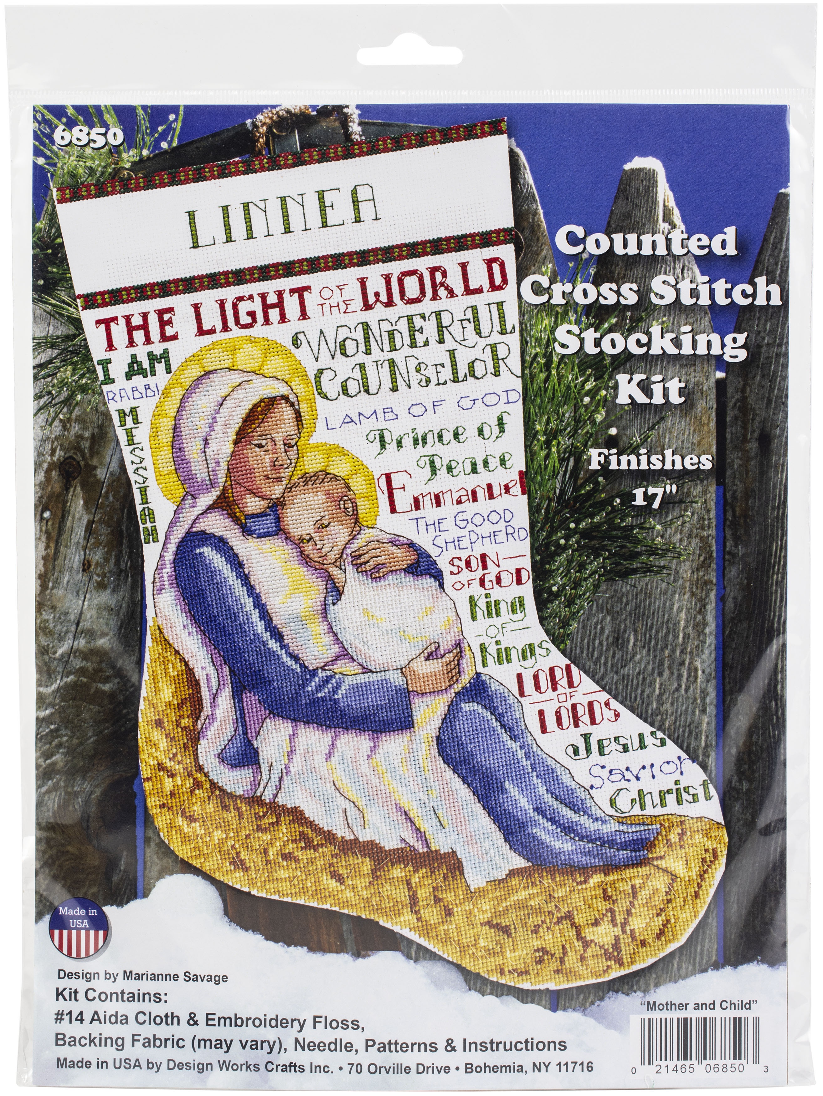 Create a beautiful cross stitch stocking with this kit. This package contains 14 count Aida cloth, embroidery floss, backing fabric, a needle, and fully illustrated instructions. Finished size: 17 inches long. Design: Mother And Child. Made in USA.