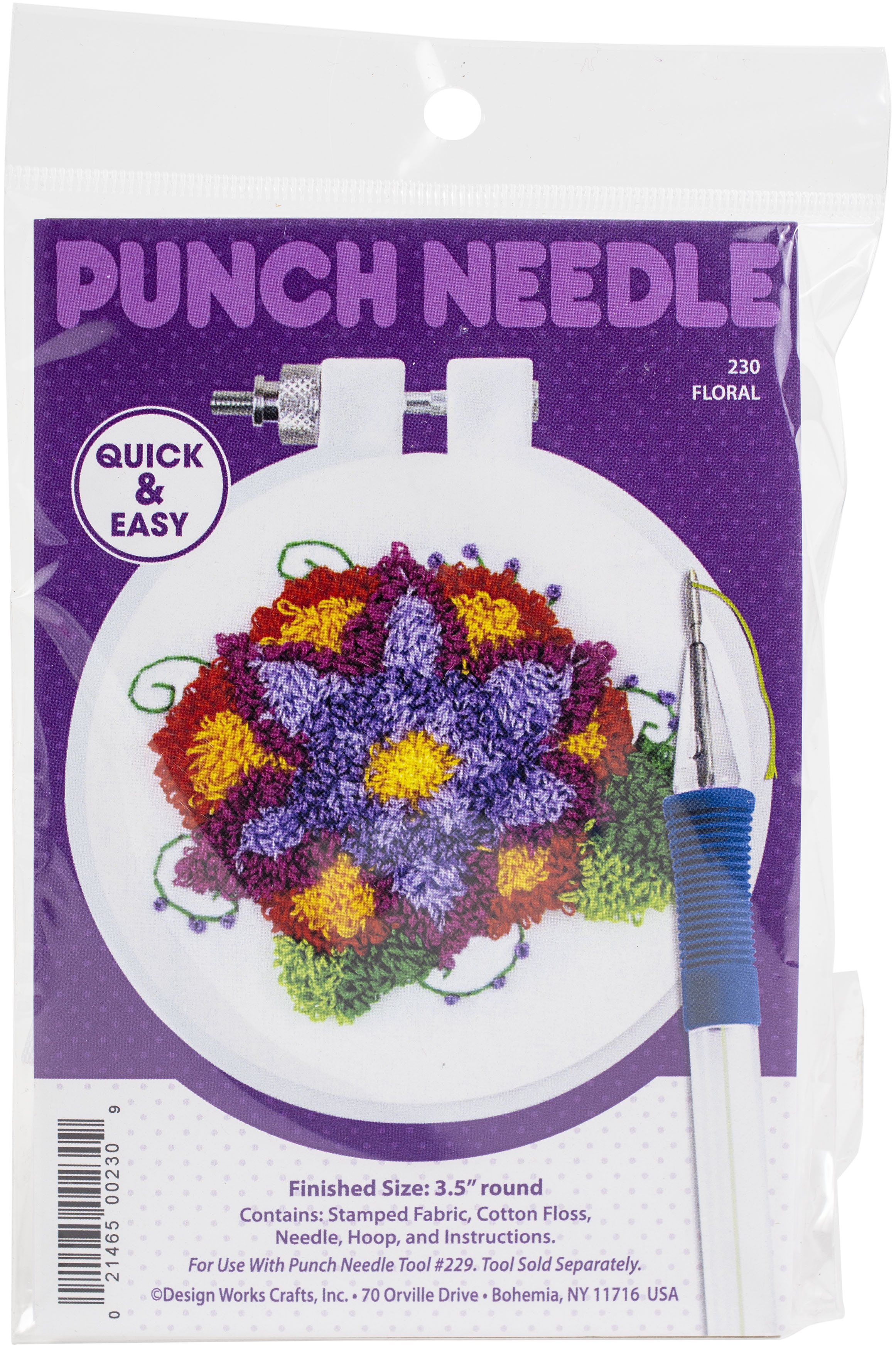 Create a fun work of art to display in in your home with quick & easy kit! This package contains stamped poly/cotton fabric, 100% cotton embroidery floss, one crewel needle, one 3 inch hoop and fully illustrated instructions. Design: Flower. Finished Size 3.5 inch round. Punch needle sold separately. Made in the USA.
